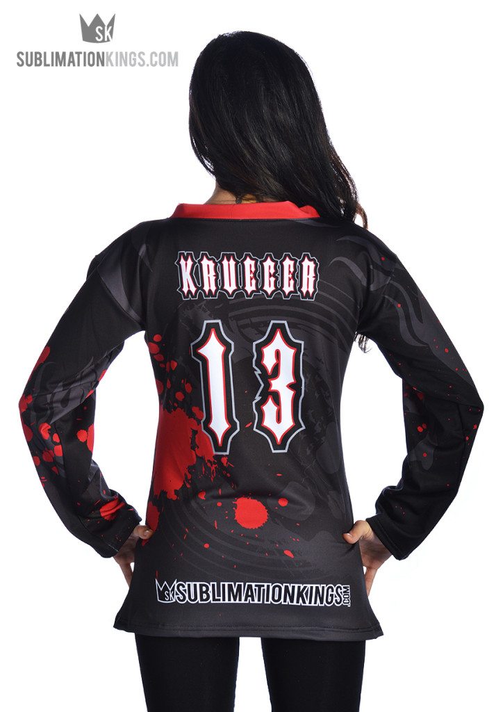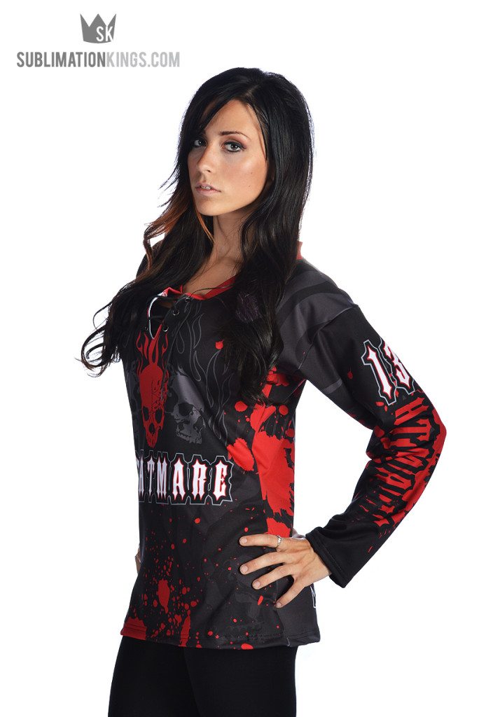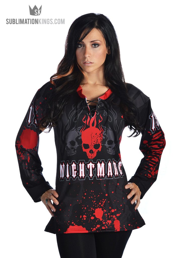 The Sublimation Kings also offer form fit sublimated Women’s Hockey Jerseys. These women’s hockey jerseys come in dazzle material or a slightly stretchier matte style material. Featured here is our Philly Puck Bunny jersey on the matte style material. Best part about these jerseys is that you can add these to your full custom hockey orders and we will transfer your men’s jersey design into the women’s jersey for purchase. So you can represent your team by having your hunny wear the same jersey while looking super fresh smacking the glass and shouting after you tally a game winning goal! http://sublimationkings.com/shop/nightmare-female-jersey/
