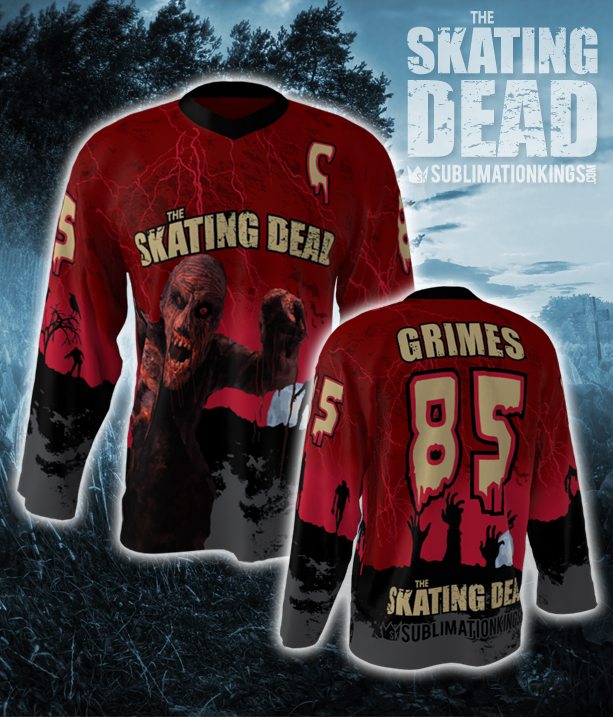 The Skating Dead Custom Hockey Jersey is perfect for the Un-Dead Hockey Squad! This look will make up for your Gory Play! http://sublimationkings.com/shop/skating-dead-hockey-jersey/