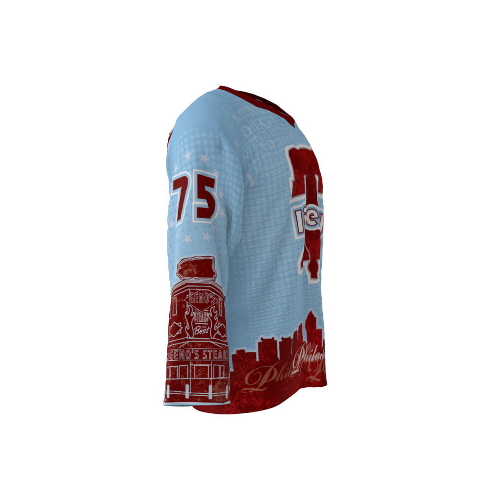 The Liberty Custom Hockey Jersey! Features the Liberty Bell, The Declaration of Independence, and other famous monuments from the city of “Brotherly Love”. Looks great on Dazzle-Shine Material! Don’t forget we now offer dry-fit Ice Hockey Material.