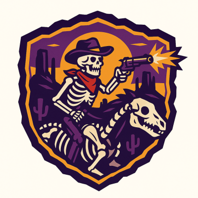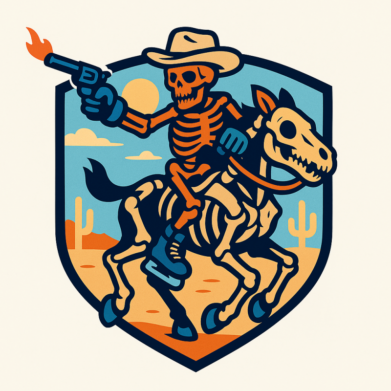 ‘I want to make a logo for a team called ‘pale riders’ – want it to be a mascot logo in a modern style crest. The crest can be a tombstone jagged/irregular edge to feel “wild” – put a wild west background within it. For the logo mascot, make it look like a cowboy that is a human skeleton – he should have no clothing, just a skeleton with a hat/bandana, riding a horse that is a skeleton. In one hand the cowboy should be shooting a time period pistol, include muzzle fire. I don’t have a color set, pick one for me – colors should be contrasting. Please only use a maximum of 5 hex colors for the logo. Please use clean sharp lines and color – no grain or mottled results. Logo only, don’t include the text please.’