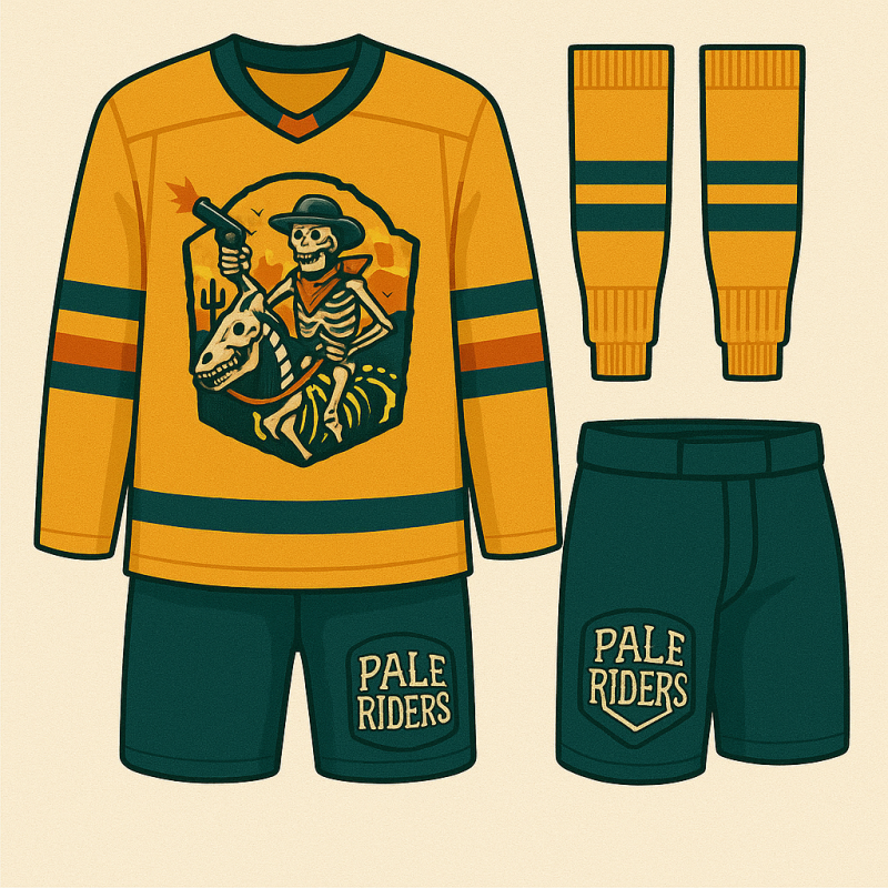 Welcome to the first installment in the series! Day 1 of 30. This particular concept revolved around a team we dubbed the ‘Pale Riders‘. We get a lot of orders and inquiries surrounding the themes of: Bandits, Outlaws, Renegades, Cowboys etc. We saw this as an opportunity to expand our custom hockey jersey lineup.