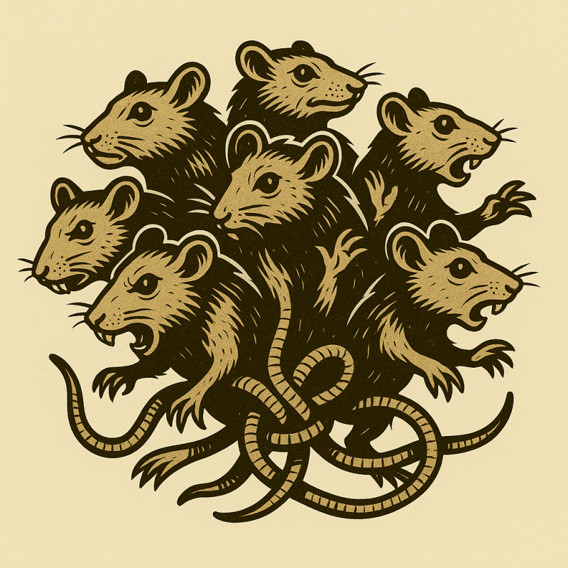 For this one we started with a question asking ‘Do you know what a rat king is?’ followed up with ‘Can you make me a modern/vintage mascot logo of a rat king based on your description above? No text needed on the logo.’. The initial results were pleasing and we just asked for a few revisions. We weren’t keen on the rats all having the same exact face – easy enough, just asked for the faces to vary. You’ll also notice in the prompt history link (as well as the gallery) the one version is pretty poor as it has random hands growing out of tails to go along with the mottle/smudged image generation).