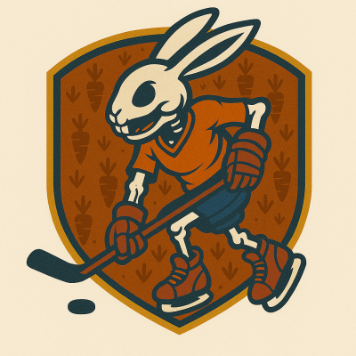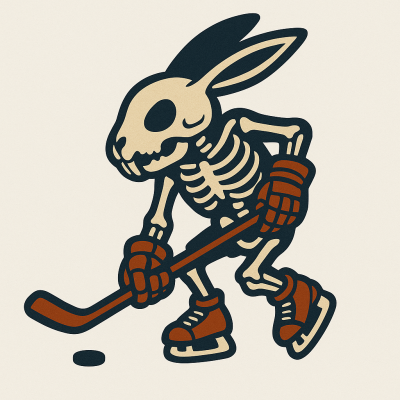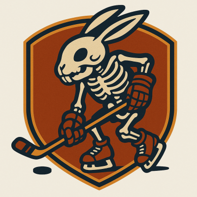 ‘I want to make a logo – want it to be a mascot logo in a vintage/modern style. The logo can also have a border with one or two outlines. For the logo mascot, can it be a rabbit skeleton playing hockey? Should have ice hockey gloves and ice hockey skates but the body that is posed should be just bones. Choose colors for me that are contrasting. Please only use a maximum of 5 hex colors for the logo. Logo only, don’t include the text please.’