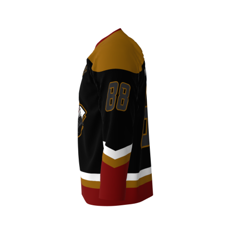 Aces Black Hockey Jersey! You can customize with your name and number! This is part of our ChatGPT design assisted collection. Since all of our product offerings are customized specifically for you, you have the ability to change the colors and team names on any product. You want to swap the colors, team name, or logo from another product you’ve seen on our site? Or even put your own logo on instead? Not a problem. These simple alterations come at NO additional cost, either. Simply request any of the above in your order notes upon ordering. If design changes are requested, you’ll receive a proof once the order is received. If this doesn’t quite do it for you, you can build your own design using our Pro-Style builder or learn more about the product in general here. This jersey is fully dye sublimated and includes round shoulders.