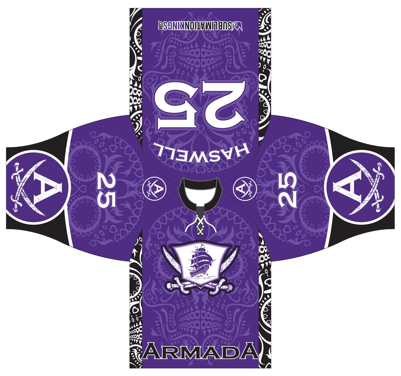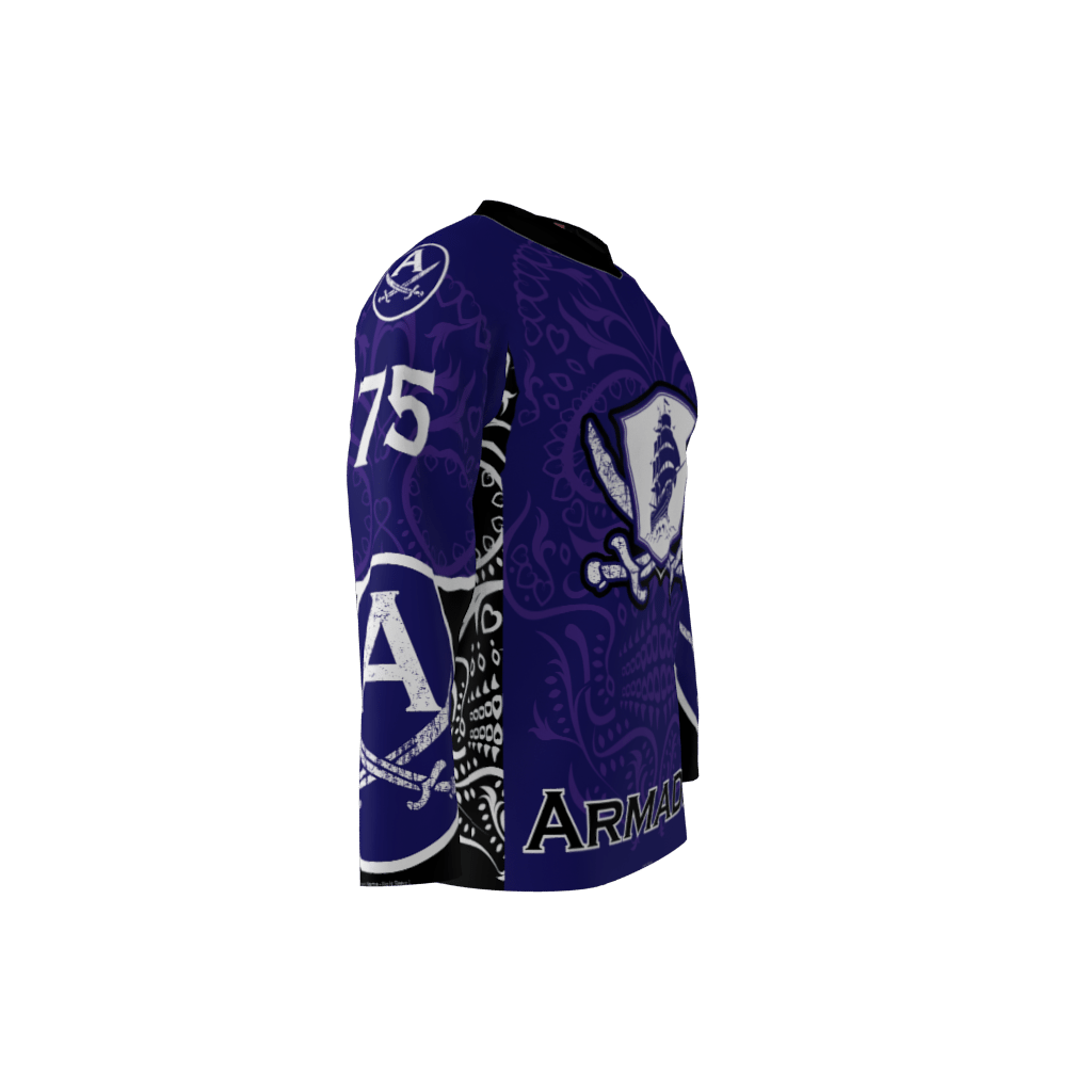 Custom dye sublimated inline/roller hockey jersey design for the Armada.. Colors consist of purple, black, and white. There are Mexican themed elements like the Mexican skull design in the background elements as well as the armada style ship. Complete flexibility in regards to color and logo.