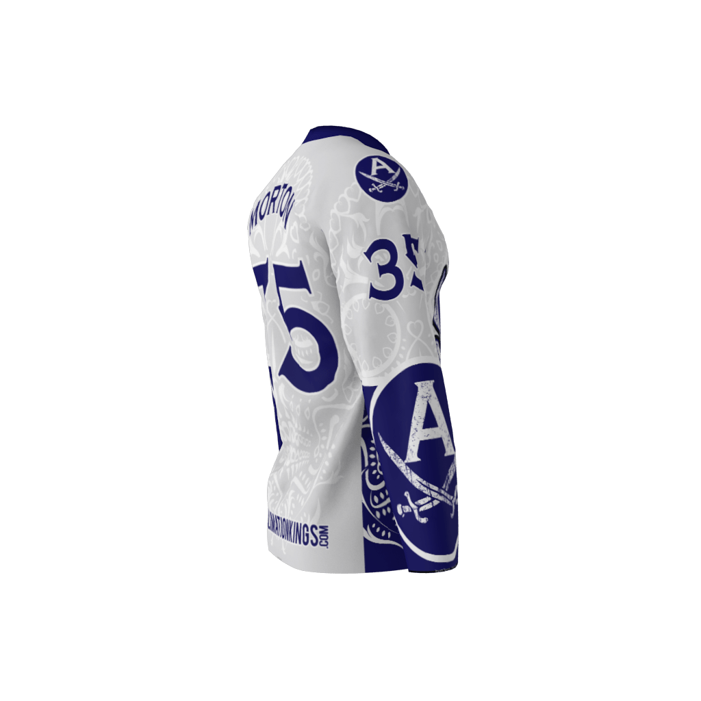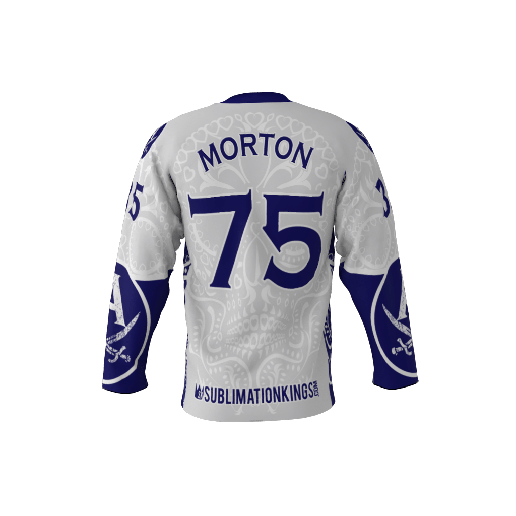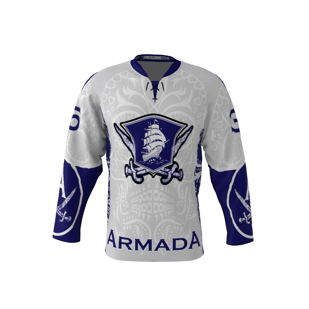 Custom dye sublimated inline/roller hockey jersey design for the Armada.. Colors consist of purple, black, and white. There are Mexican themed elements like the Mexican skull design in the background elements as well as the armada style ship. Complete flexibility in regards to color and logo.