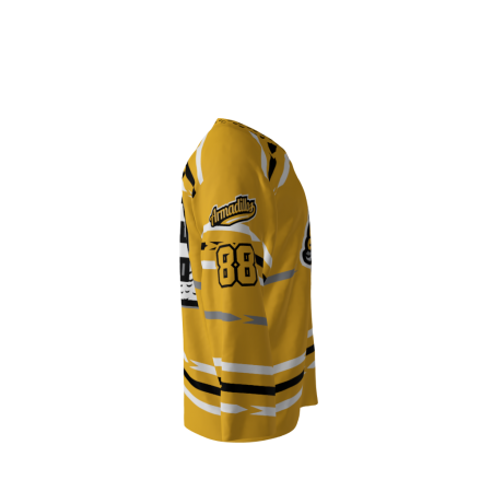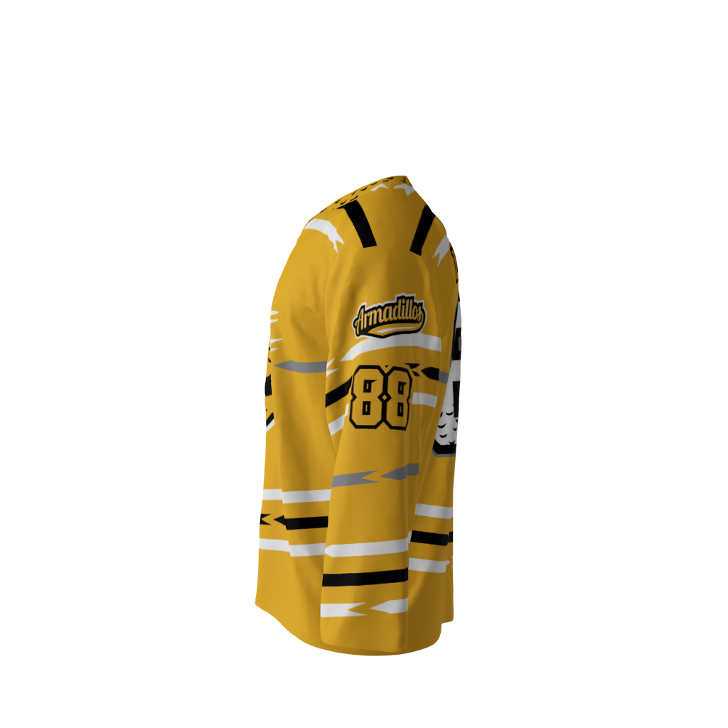 Armadillos Gold Hockey Jersey! You can customize with your name and number! Since all of our product offerings are customized specifically for you, you have the ability to change the colors and team names on any product. You want to swap the colors, team name, or logo from another product you’ve seen on our site? Or even put your own logo on instead? Not a problem. These simple alterations come at NO additional cost, either. Simply request any of the above in your order notes upon ordering. If design changes are requested, you’ll receive a proof once the order is received.