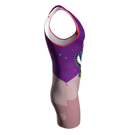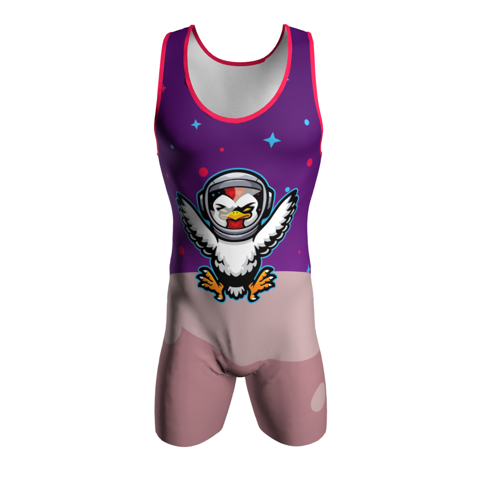 Custom Dye Sublimated Astro Chicken Wrestling Singlet. The designs are dyed right into the fabric for a smooth, vibrant, lightweight, high performing jersey. SKWrestle singlets are made from moisture wicking polyester/lycra material. Our leg elastic is non-gripper meaning that its comfortable and wont rip your skin. Our wrestling singlets are 100% fully sublimated. The designs will never crack, peel, or fade away as they are dyed into the material itself. Sublimation looks better, lasts longer, and gives you more design options.