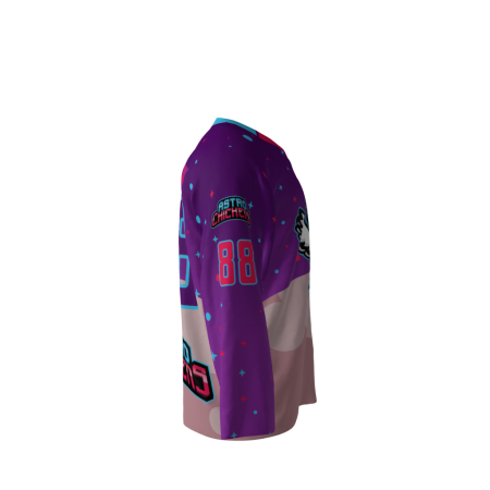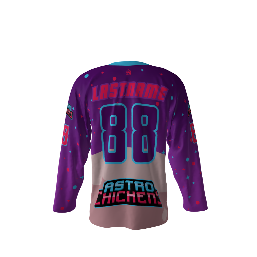 Astro Chickens Hockey Jersey! You can customize with your name and number! Since all of our product offerings are customized specifically for you, you have the ability to change the colors and team names on any product. You want to swap the colors, team name, or logo from another product you’ve seen on our site? Or even put your own logo on instead? Not a problem. These simple alterations come at NO additional cost, either. Simply request any of the above in your order notes upon ordering. If design changes are requested, you’ll receive a proof once the order is received.