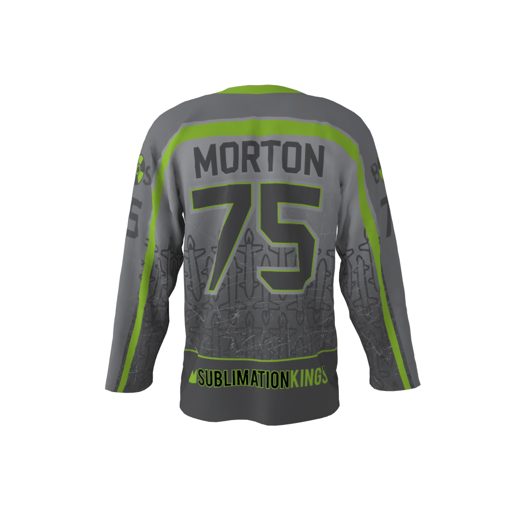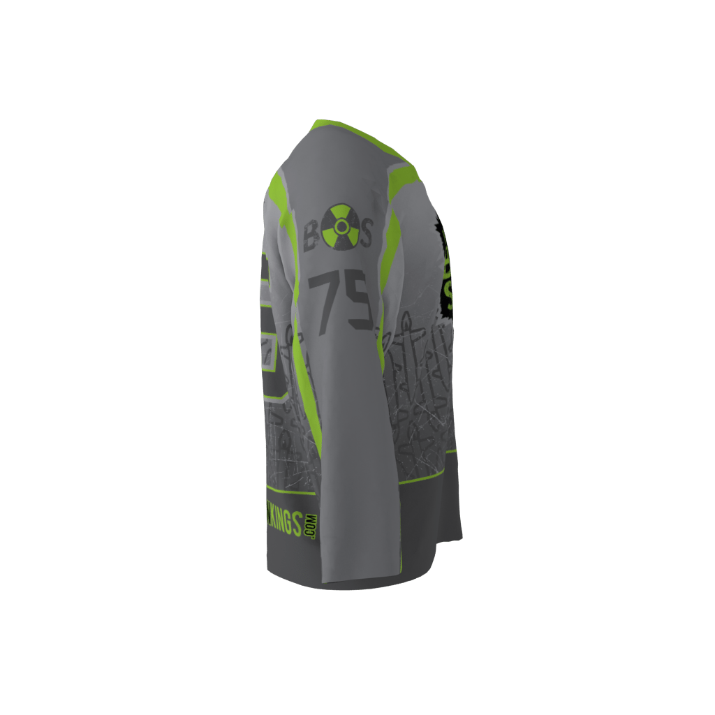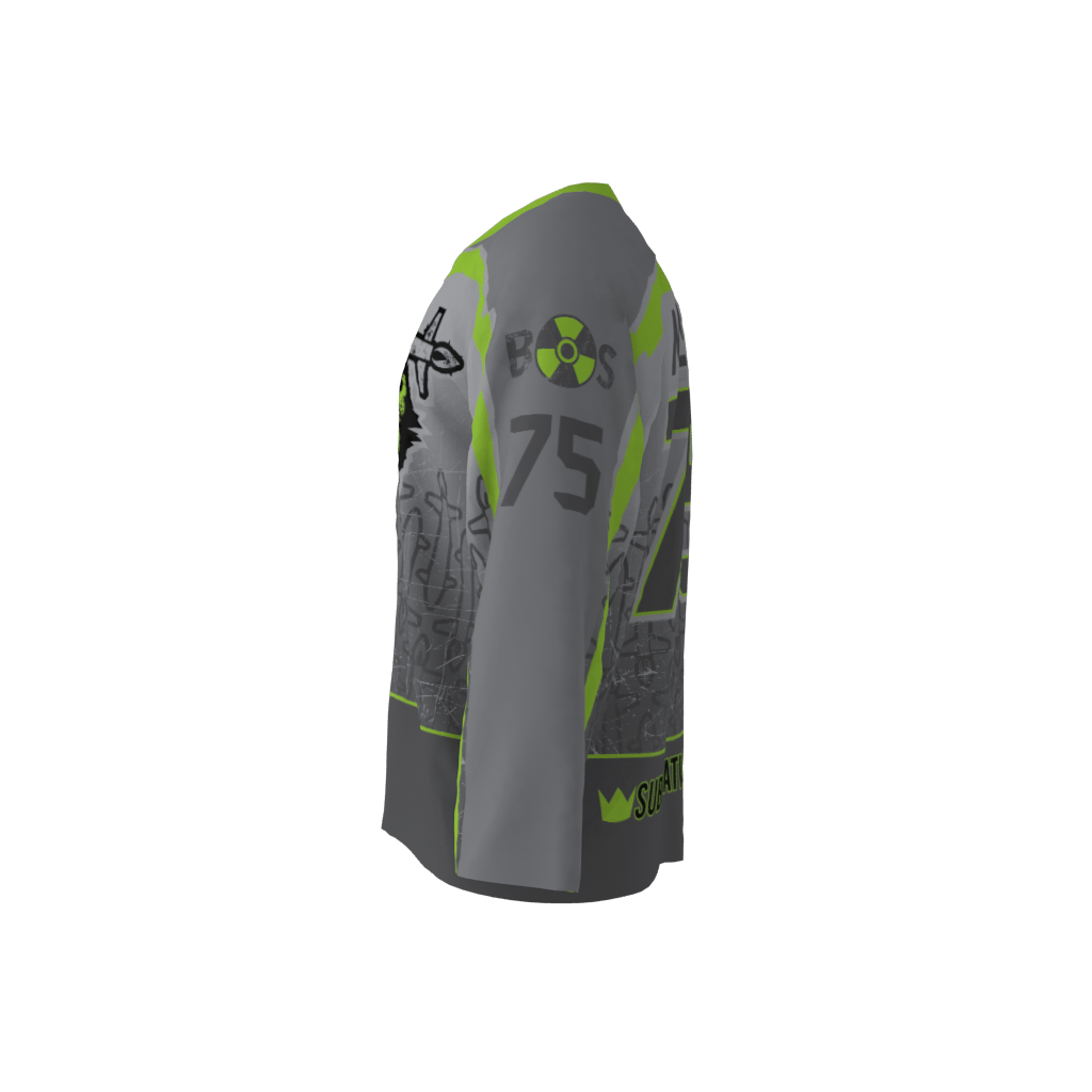 The Bomb Squad gray alternate. Custom roller hockey jersey design which consists of lime green and shades of gray/black. There is a slight military theme being mimicked here with the bombs/stars/medals/ranks. Some texturing has been applied to give it that radioactive feel.