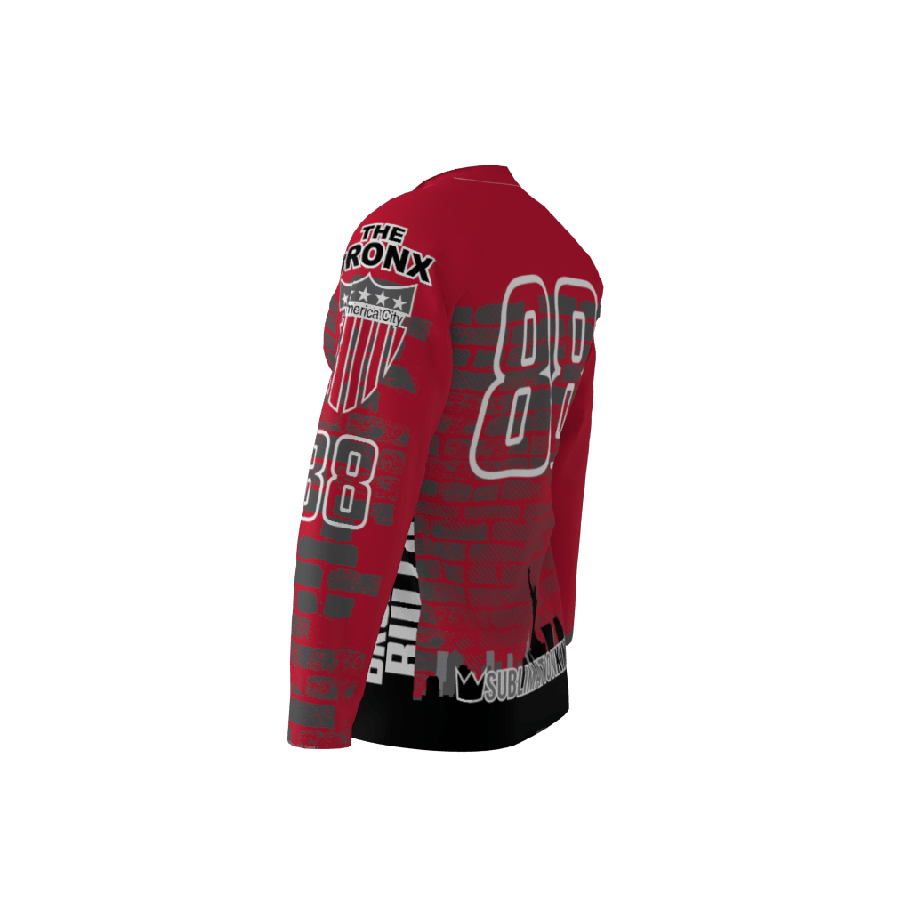 Straight outta da Bronx, the Broadway Bullies Custom Hockey Jerseys!. Jersey features a red base adorned with brick walls and city skylines. You’ll find other Bronx related illustrations on the sleeves as well.