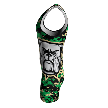 Custom Dye Sublimated Bulldogs Wrestling Singlet. The designs are dyed right into the fabric for a smooth, vibrant, lightweight, high performing jersey. We cannot use unauthorized licensed logos (example: NBA, NHL, MLB, NFL team logos). If you upload licensed logos we will be forced to refund your order.