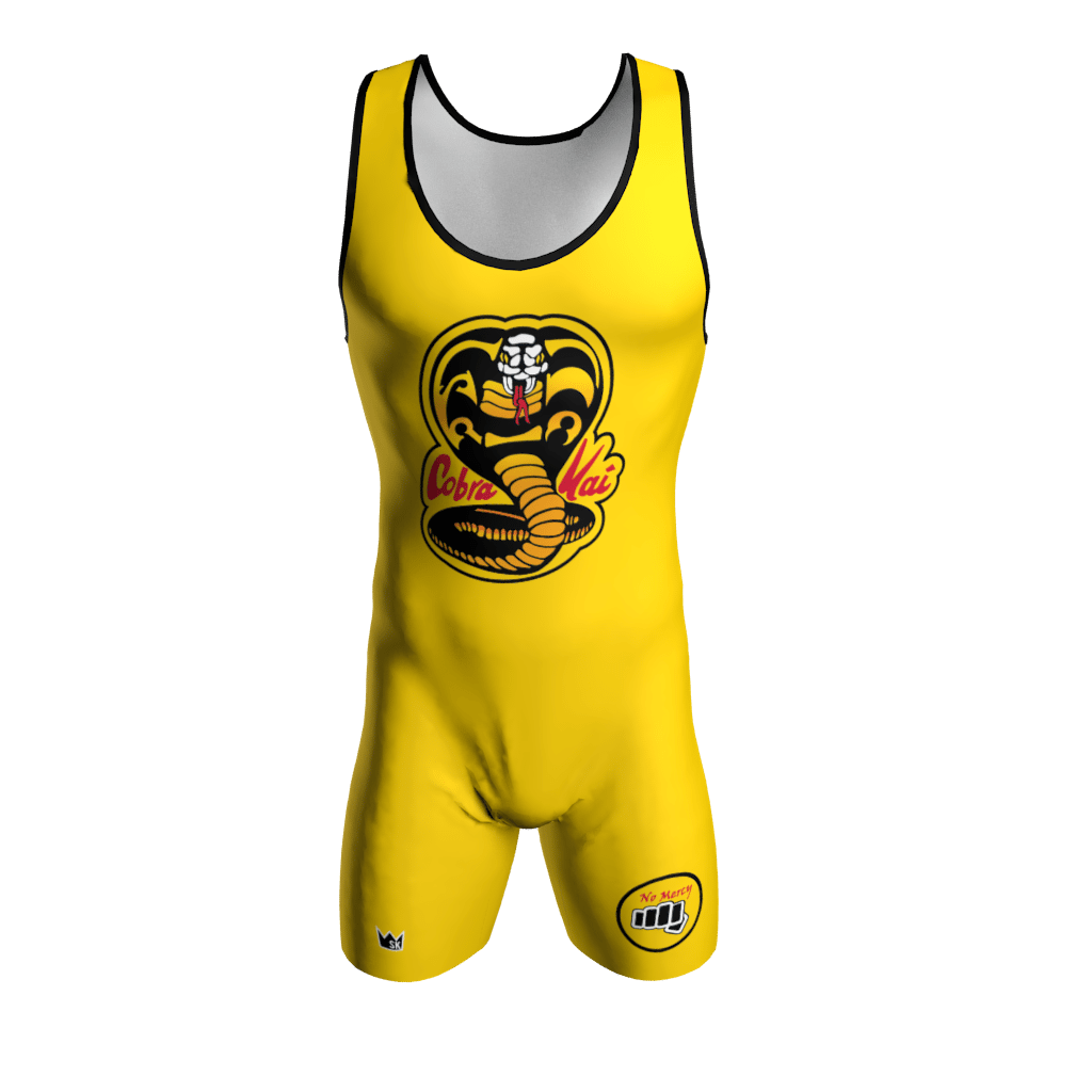 Custom Dye Sublimated Cobra Kai Wrestling Singlet. The designs are dyed right into the fabric for a smooth, vibrant, lightweight, high performing jersey. We cannot use unauthorized licensed logos (example: NBA, NHL, MLB, NFL team logos). If you upload licensed logos we will be forced to refund your order.