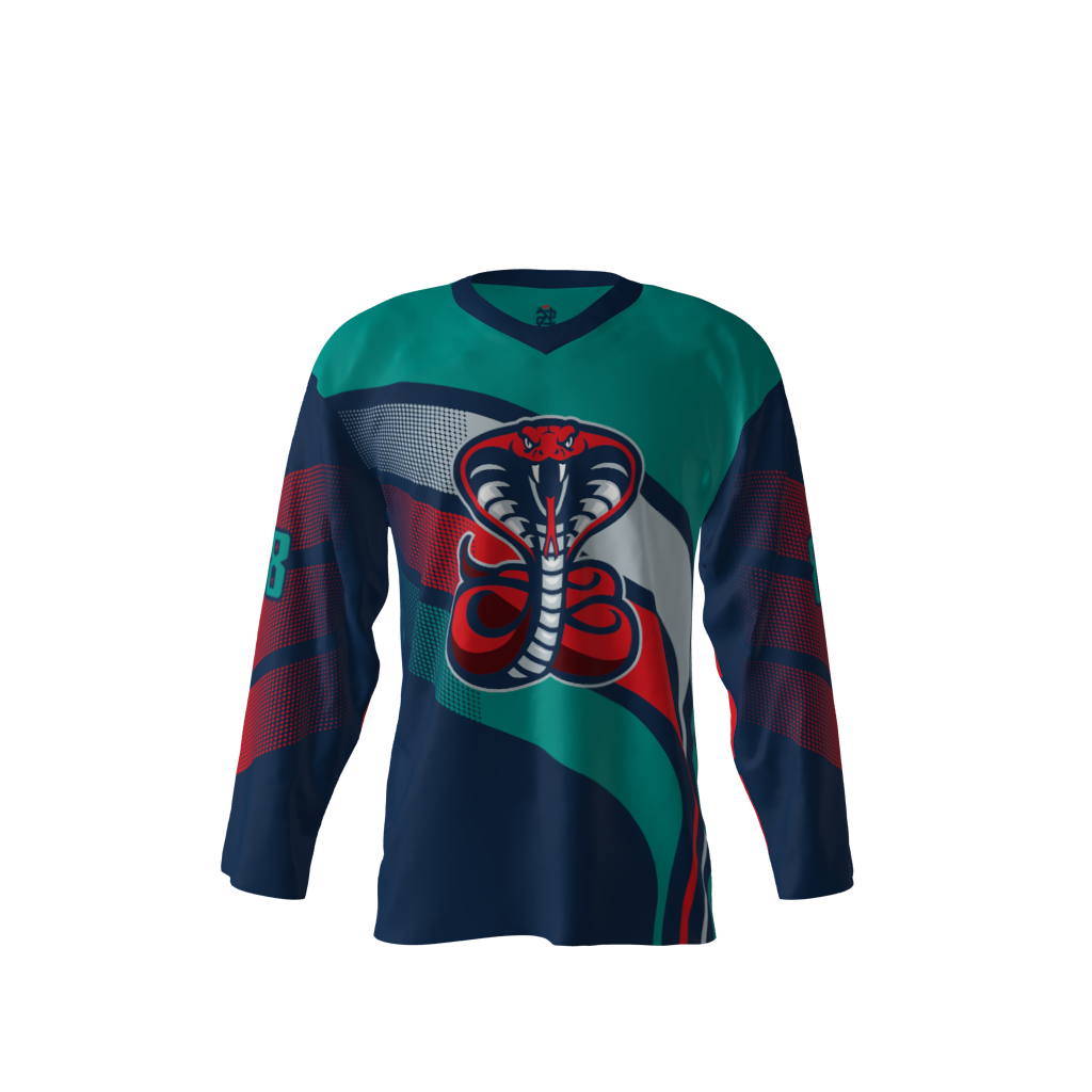 Cobras Custom Dye Sublimated Hockey Jersey. You can customize with your name and number! Since all of our product offerings are customized specifically for you, you have the ability to change the colors and team names on any product. You want to swap the colors, team name, or logo from another product you’ve seen on our site? Or even put your own logo on instead? Not a problem. These simple alterations come at NO additional cost, either. Simply request any of the above in your order notes upon ordering. You’ll receive a proof once the order is received. Sizing information here.