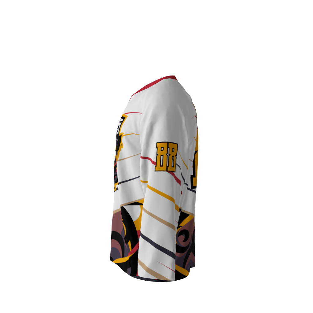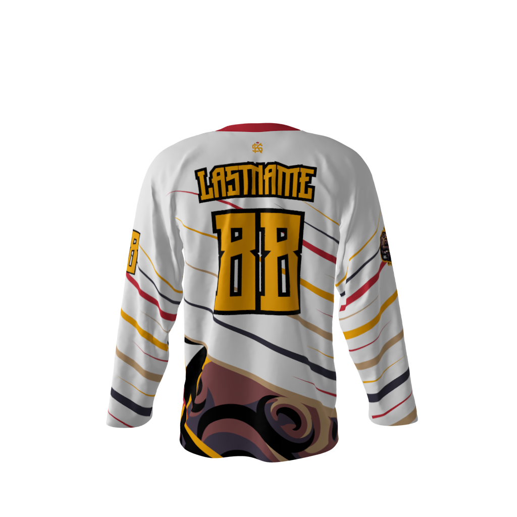 Comets White Custom Dye Sublimated Hockey Jersey. You can customize with your name and number! Since all of our product offerings are customized specifically for you, you have the ability to change the colors and team names on any product. You want to swap the colors, team name, or logo from another product you’ve seen on our site? Or even put your own logo on instead? Not a problem. These simple alterations come at NO additional cost, either. Simply request any of the above in your order notes upon ordering. You’ll receive a proof once the order is received. Sizing information here.