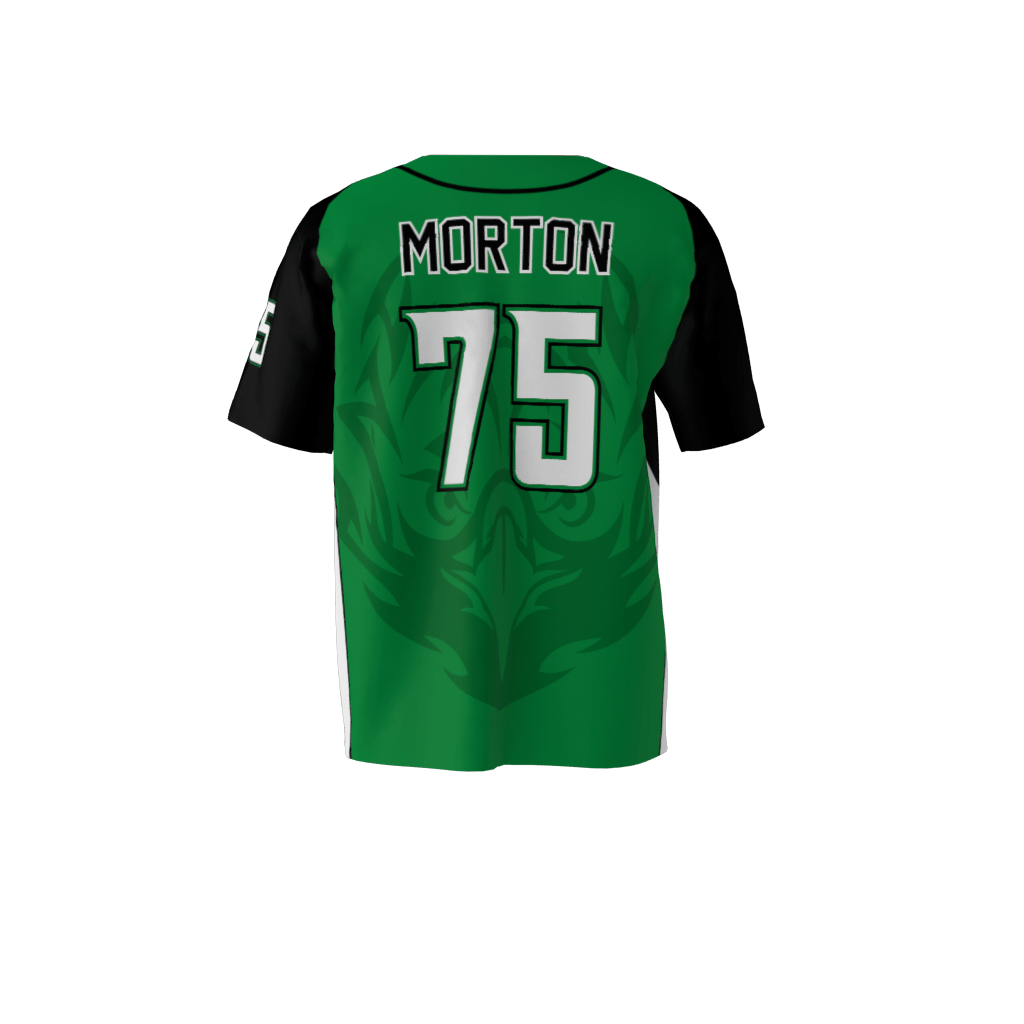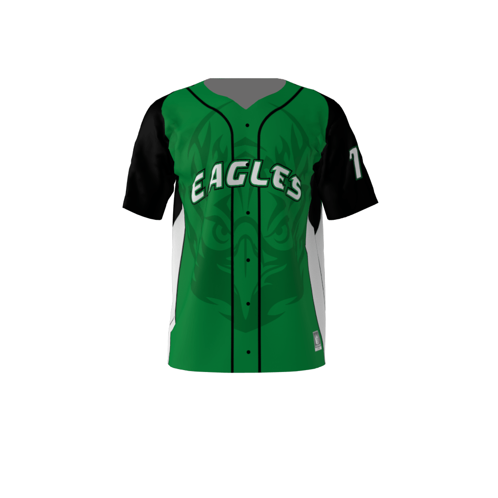 Eagles custom dye sublimated full-button baseball jersey. Available in any color combination. Materials and sizing information available here.