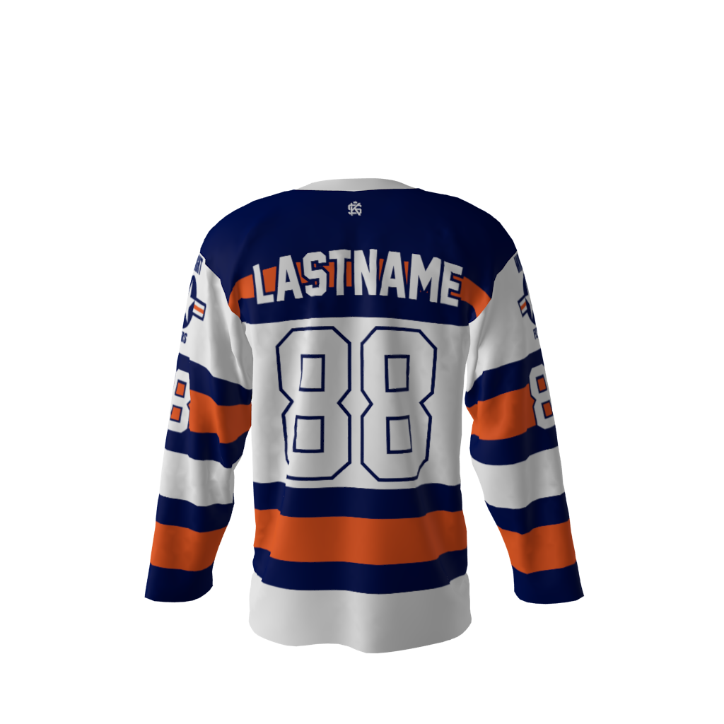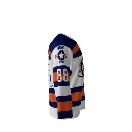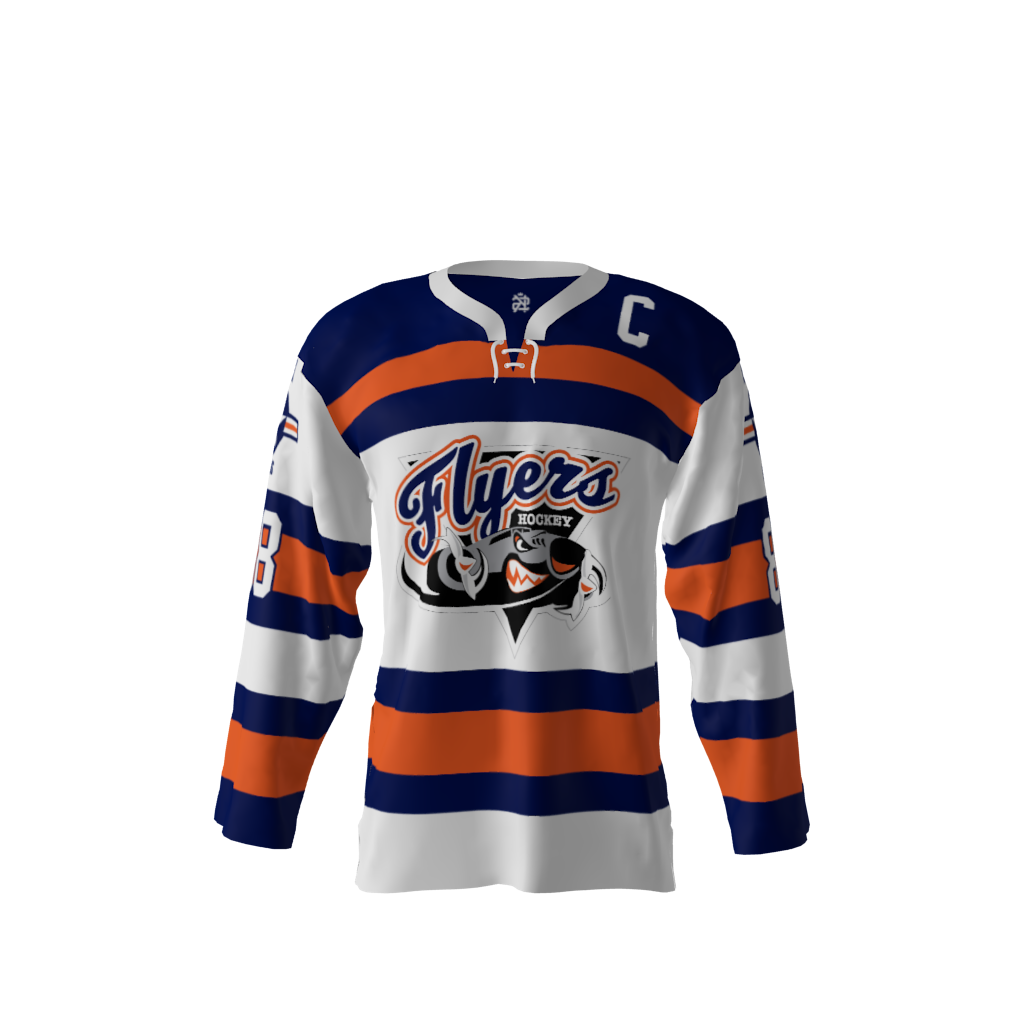 Flyers Custom Dye Sublimated Hockey Jersey. You can customize with your name and number! Since all of our product offerings are customized specifically for you, you have the ability to change the colors and team names on any product. You want to swap the colors, team name, or logo from another product you’ve seen on our site? Or even put your own logo on instead? Not a problem. These simple alterations come at NO additional cost, either. Simply request any of the above in your order notes upon ordering. You’ll receive a proof once the order is received. Sizing information here.