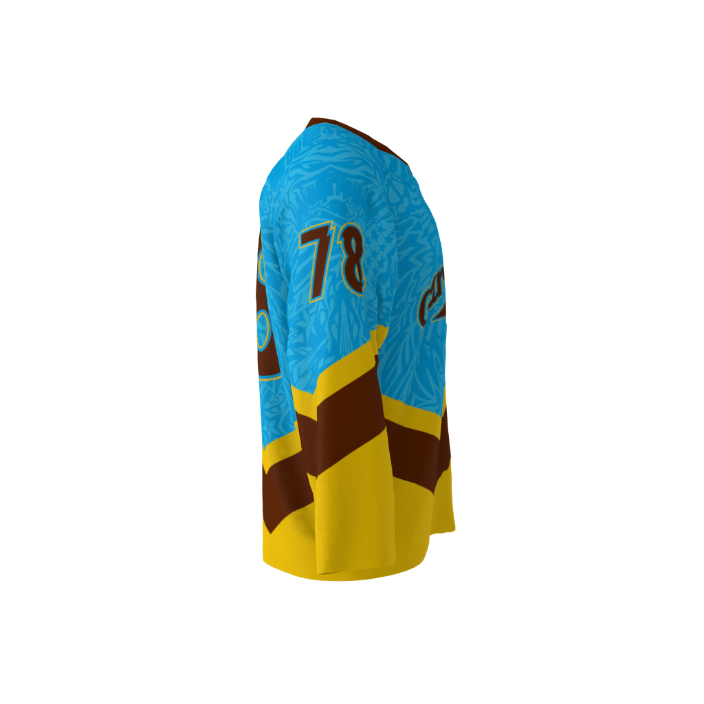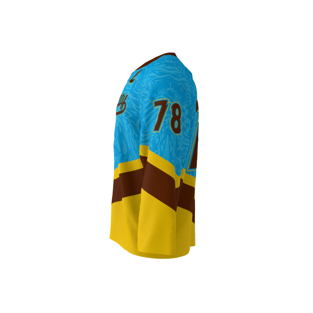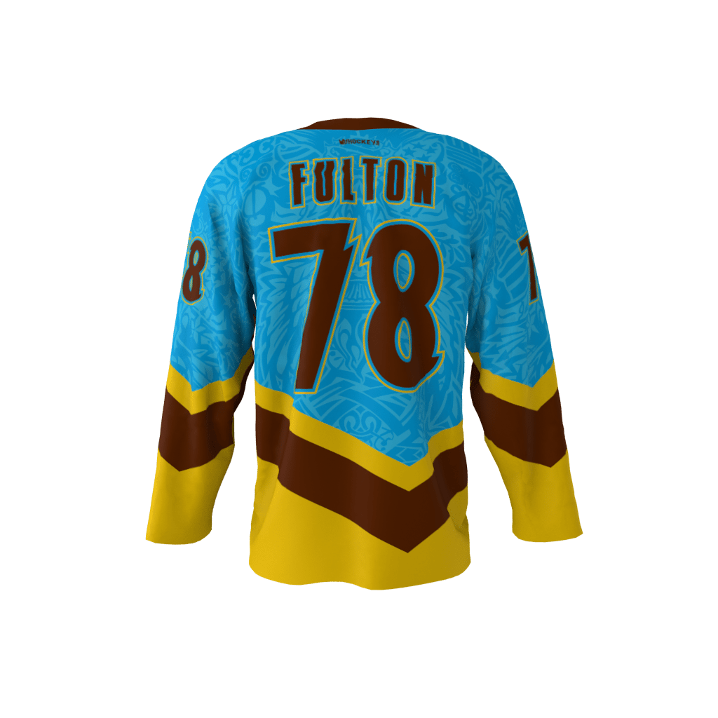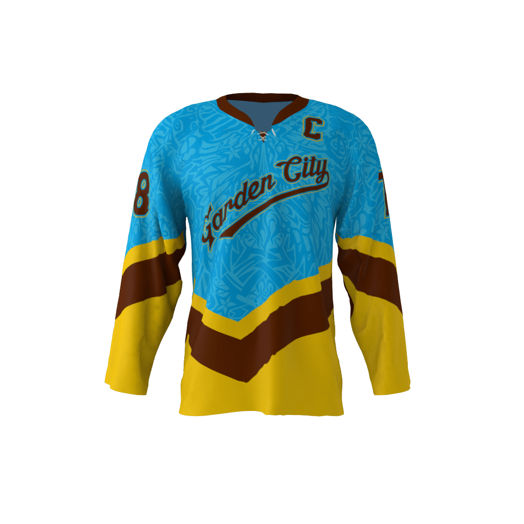 Garden City custom dye sublimated hockey jersey. Shown in this product is the captain ‘C’ on the front of the jersey. Jersey will not display the ‘C’ or ‘A’ on front unless specified in checkout notes. The logo text area can be modified to whatever your team name is! You can customize with your name and number!