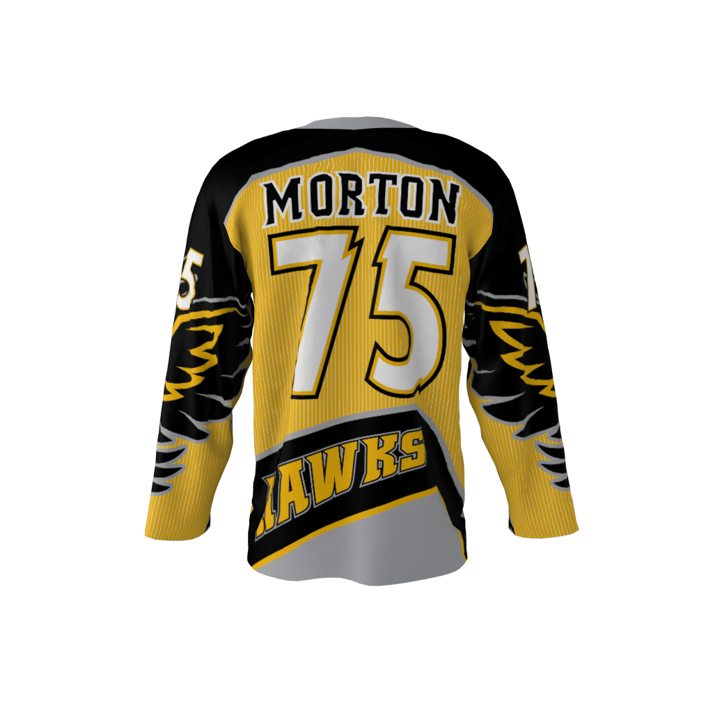 The Hawks custom hockey jersey is comprised of gold, black and silver with white pinstripes over gold. A large Hawk is found on front chest and wings are on each sleeve. Hawks have very good eyesight for the twine and are able to pick apart goalies. Their natural habitat is the goal crease and prey on loose pucks. Teams donning the Hawks jerseys tend to soar up the standings in league competition.
