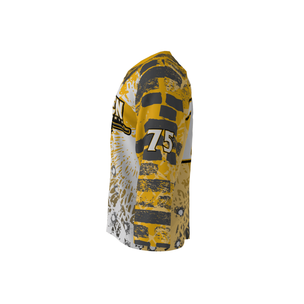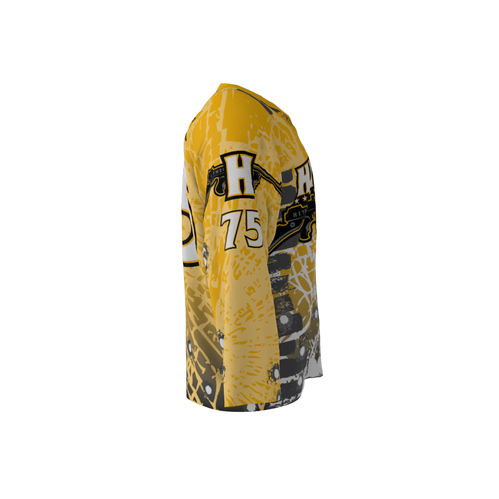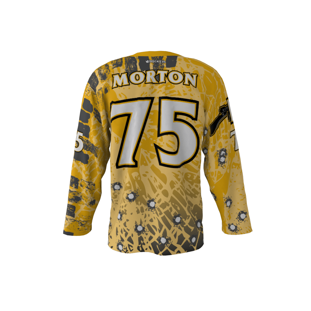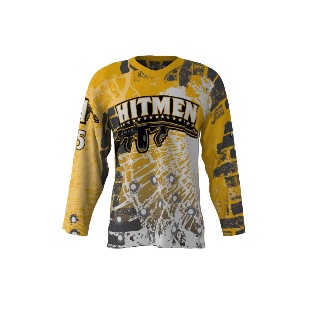Hitmen Custom Roller Hockey Jersey. This design features brick walls littered with bullet holes. The color scheme is gold/gray/black. Original customizable logo can reflect the city or descriptor above “Hitmen”. Fully vector.