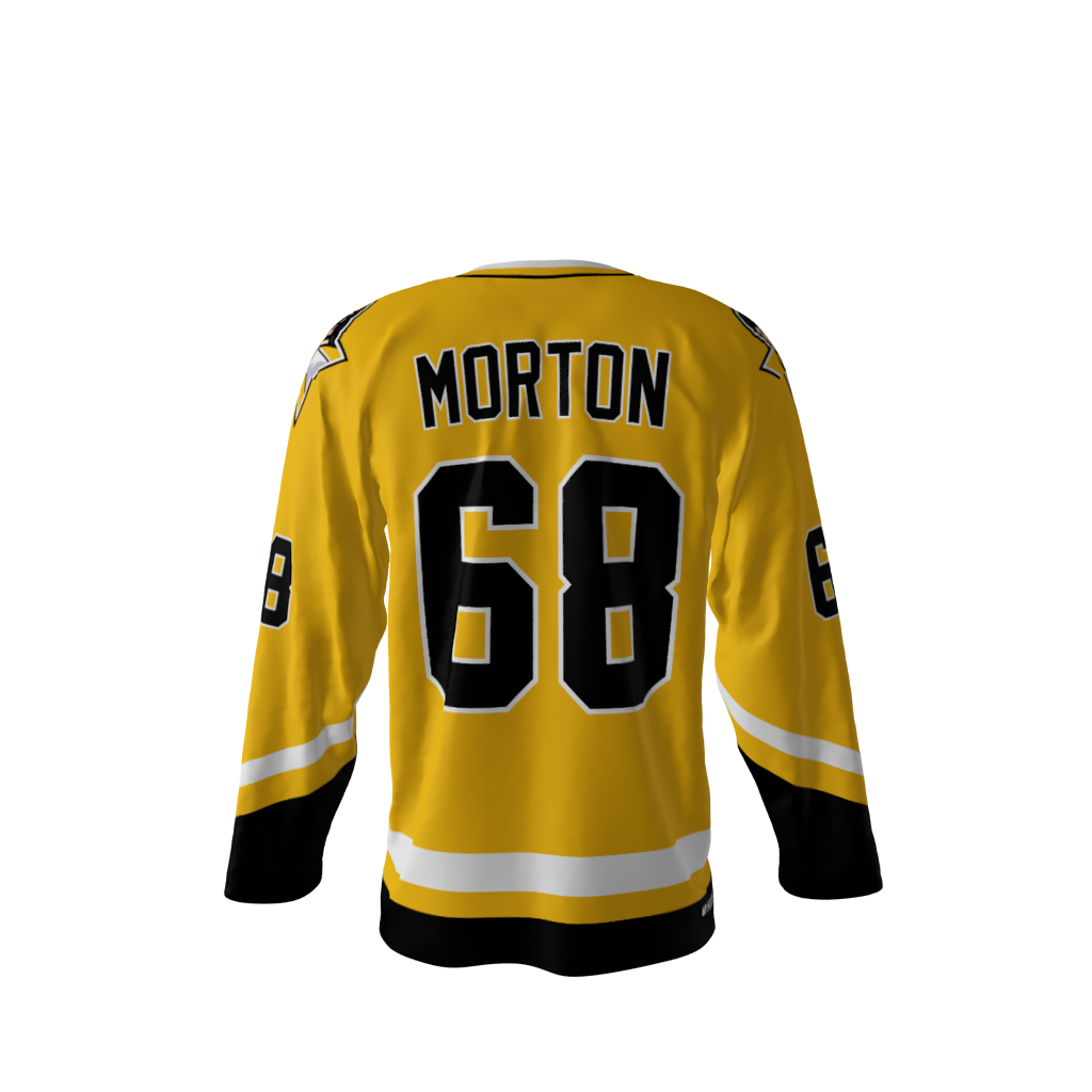 Jagr Bombs Gold Alternate Custom Dye Sublimated Jersey. You’re familiar with the legendary mullet of the 1990’s. Now you can hearken back to the days of Pittsburgh’s classic base jersey design…but…shoulders emblazoned with a Jagr Bombs logo created in the shape you might have come to expect. You can customize with your name and number! Since all of our product offerings are customized specifically for you, you have the ability to change the colors and team names on any product. You want to swap the colors, team name, or logo from another product you’ve seen on our site? Or even put your own logo on instead? Not a problem. These simple alterations come at NO additional cost, either. Simply request any of the above in your order notes upon ordering. You’ll receive a proof once the order is received.