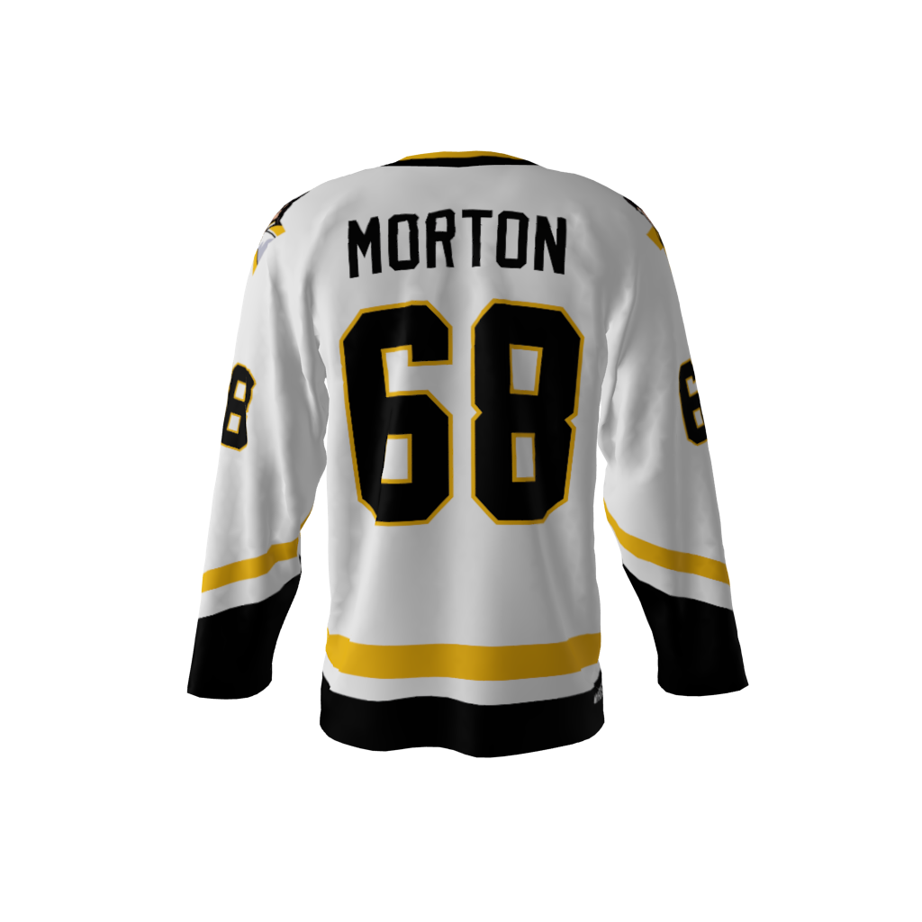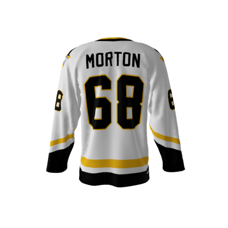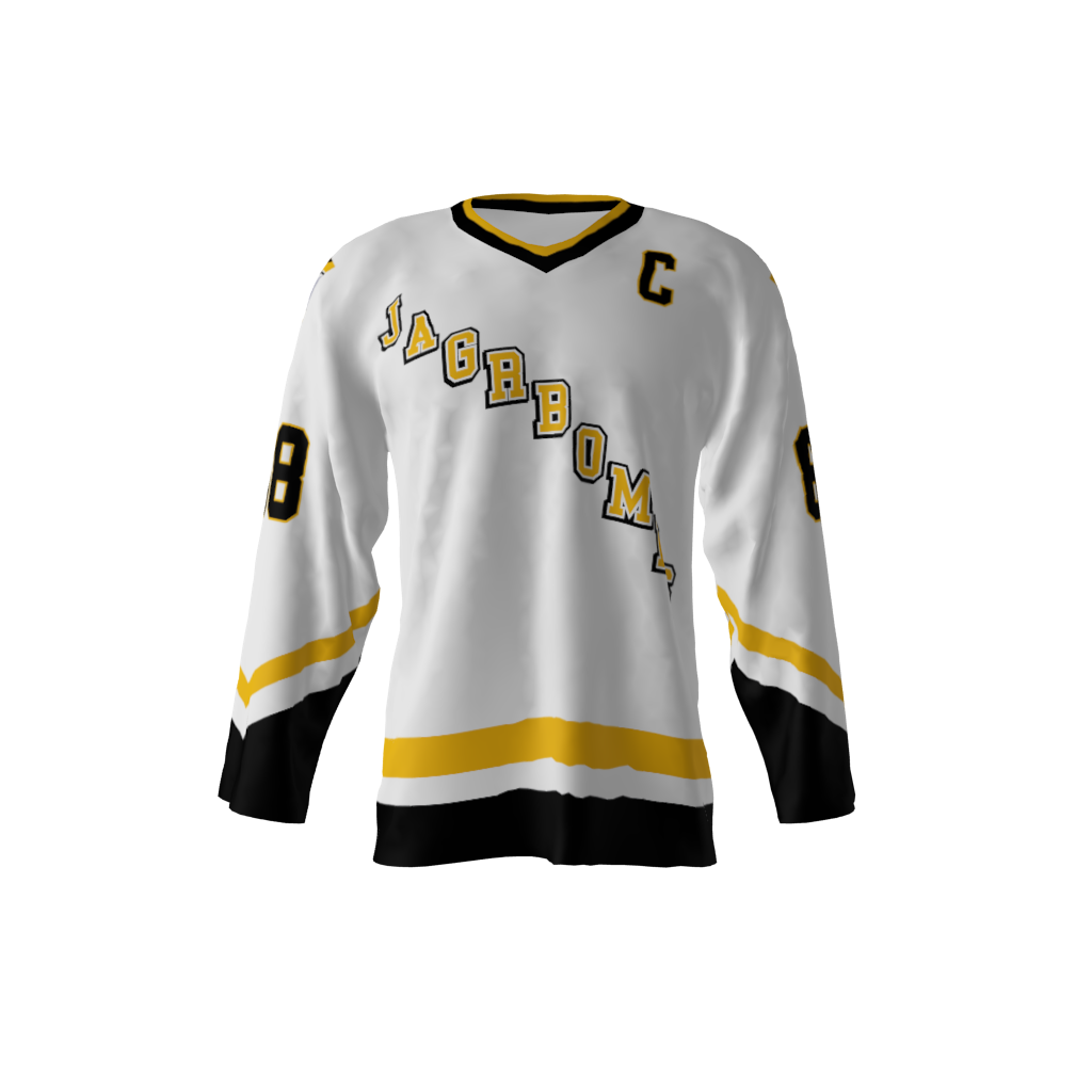 Jagr Bombs White Alternate Custom Dye Sublimated Jersey. You’re familiar with the legendary mullet of the 1990’s. Now you can hearken back to the days of Pittsburgh’s classic base jersey design…but…shoulders emblazoned with a Jagr Bombs logo created in the shape you might have come to expect. You can customize with your name and number! Since all of our product offerings are customized specifically for you, you have the ability to change the colors and team names on any product. You want to swap the colors, team name, or logo from another product you’ve seen on our site? Or even put your own logo on instead? Not a problem. These simple alterations come at NO additional cost, either. Simply request any of the above in your order notes upon ordering. You’ll receive a proof once the order is received.