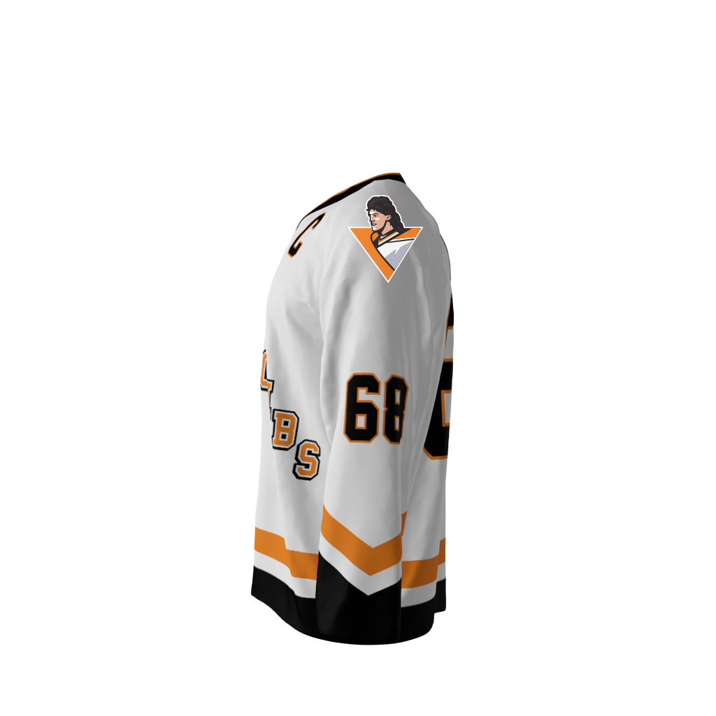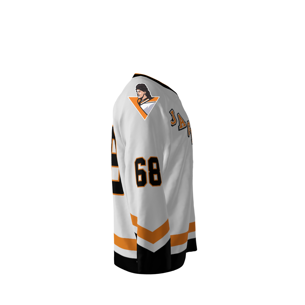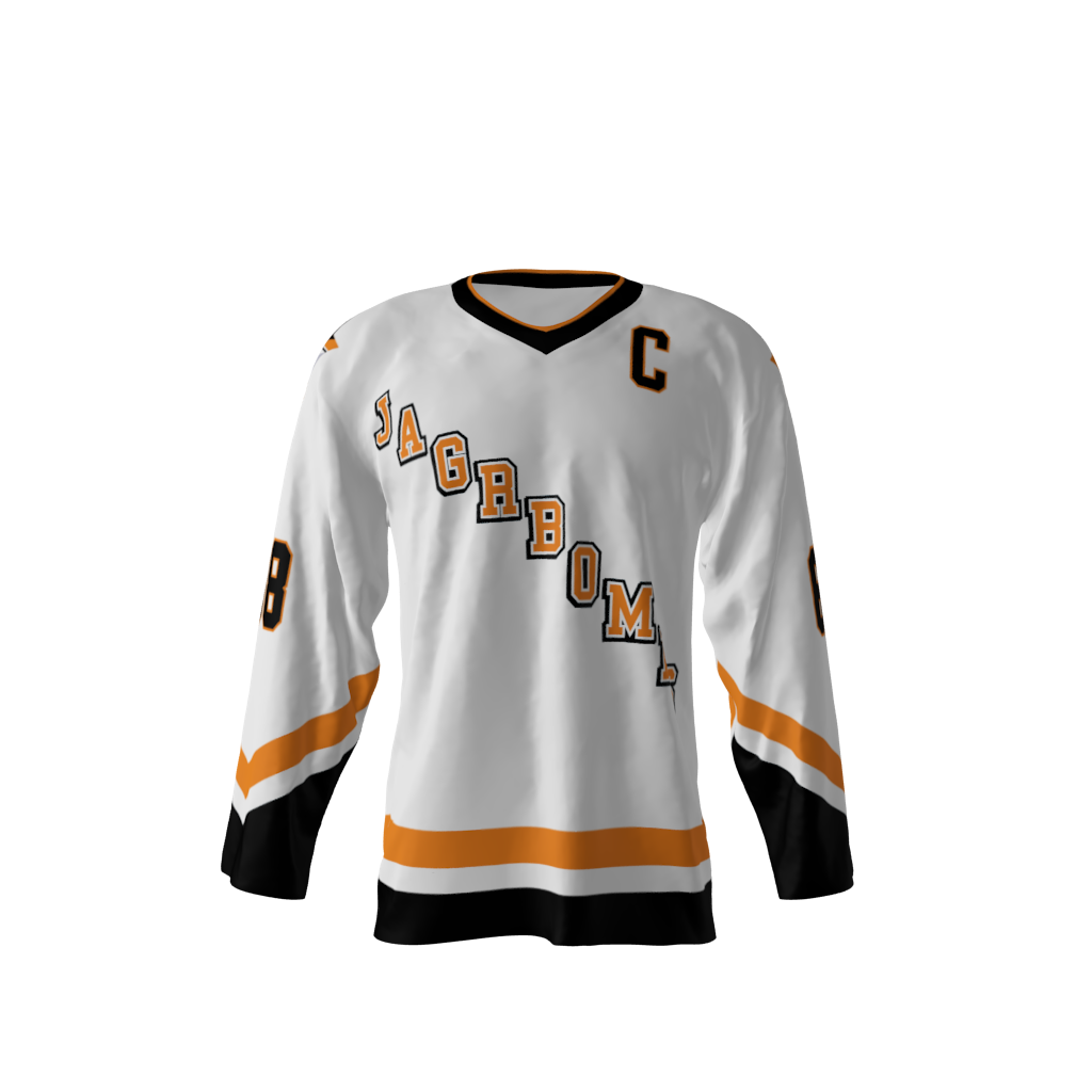 Jagr Bombs White Orange Alternate Custom Dye Sublimated Jersey. You’re familiar with the legendary mullet of the 1990’s. Now you can hearken back to the days of Pittsburgh’s classic base jersey design…but…shoulders emblazoned with a Jagr Bombs logo created in the shape you might have come to expect. You can customize with your name and number! Since all of our product offerings are customized specifically for you, you have the ability to change the colors and team names on any product. You want to swap the colors, team name, or logo from another product you’ve seen on our site? Or even put your own logo on instead? Not a problem. These simple alterations come at NO additional cost, either. Simply request any of the above in your order notes upon ordering. You’ll receive a proof once the order is received.