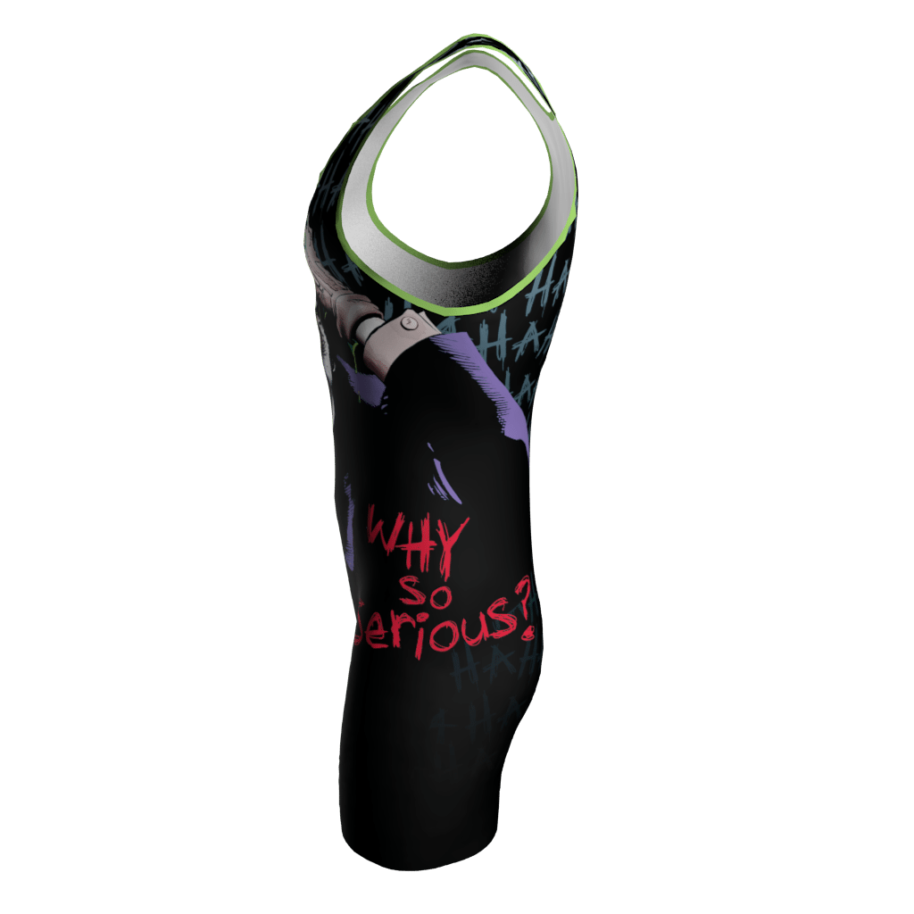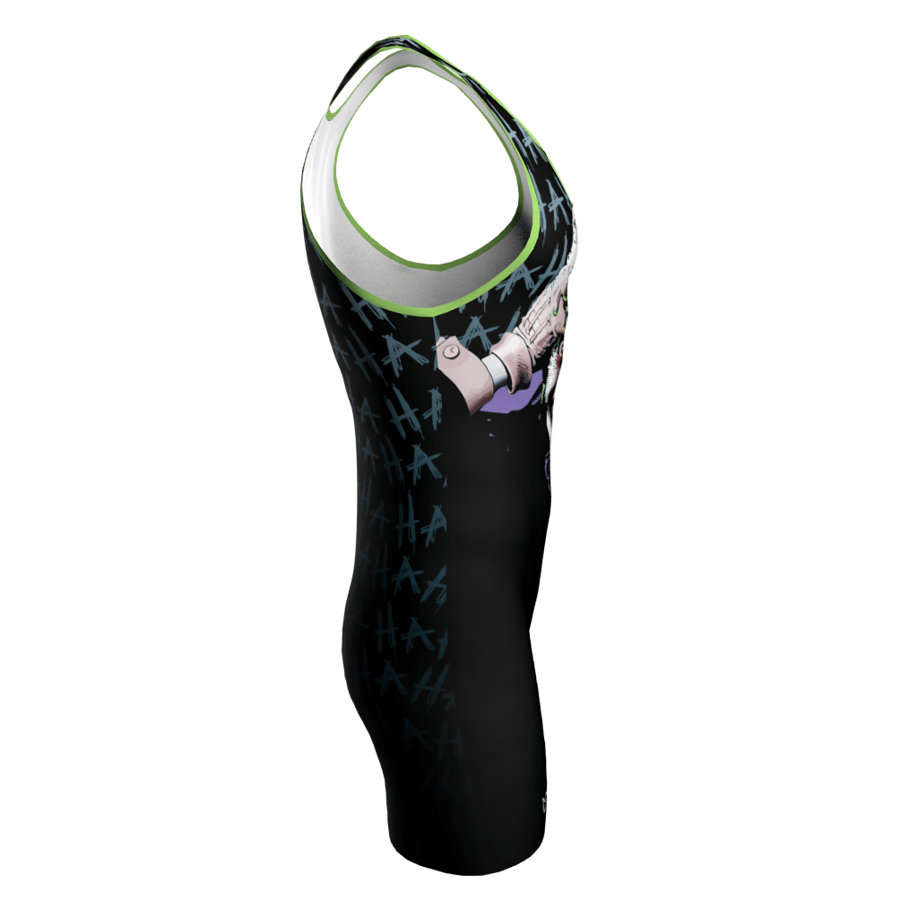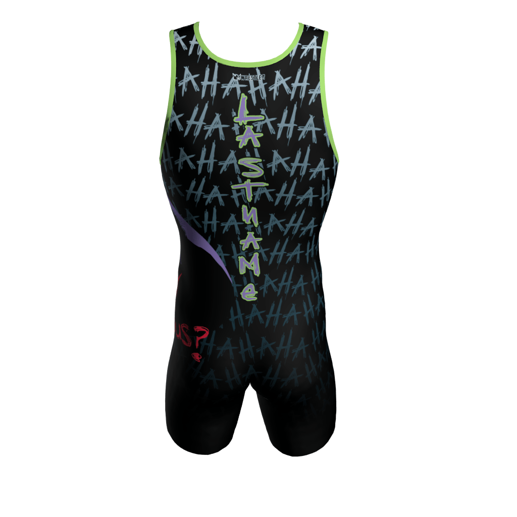 Custom Dye Sublimated Joker Wrestling Singlet. The designs are dyed right into the fabric for a smooth, vibrant, lightweight, high performing jersey. We cannot use unauthorized licensed logos (example: NBA, NHL, MLB, NFL team logos). If you upload licensed logos we will be forced to refund your order.
