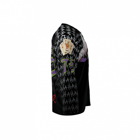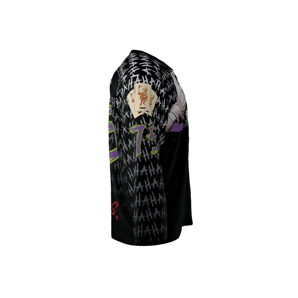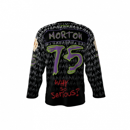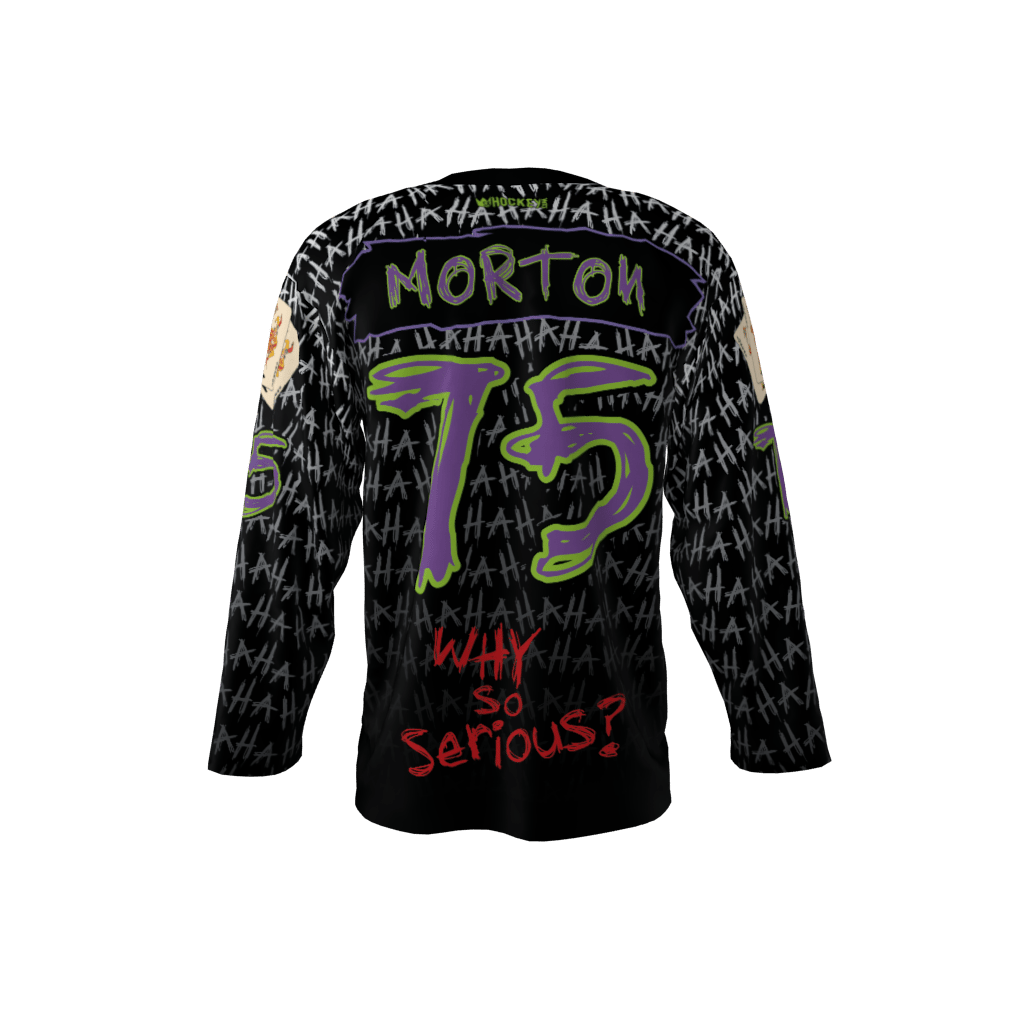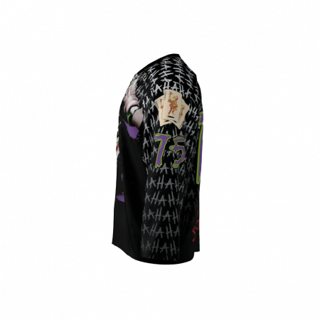 Jokers custom dye sublimated hockey jersey. Personalize it with your own name and number. Jokers jersey font set has some lower case and some reversed letters. Joker hand writes in chaotic style apparently.