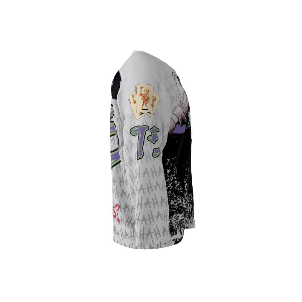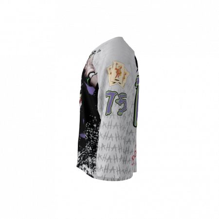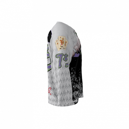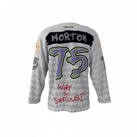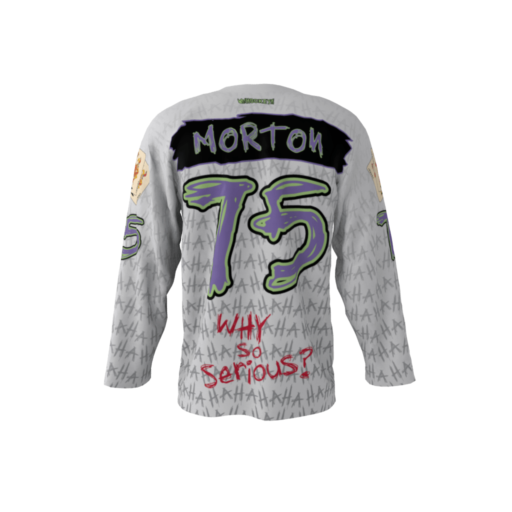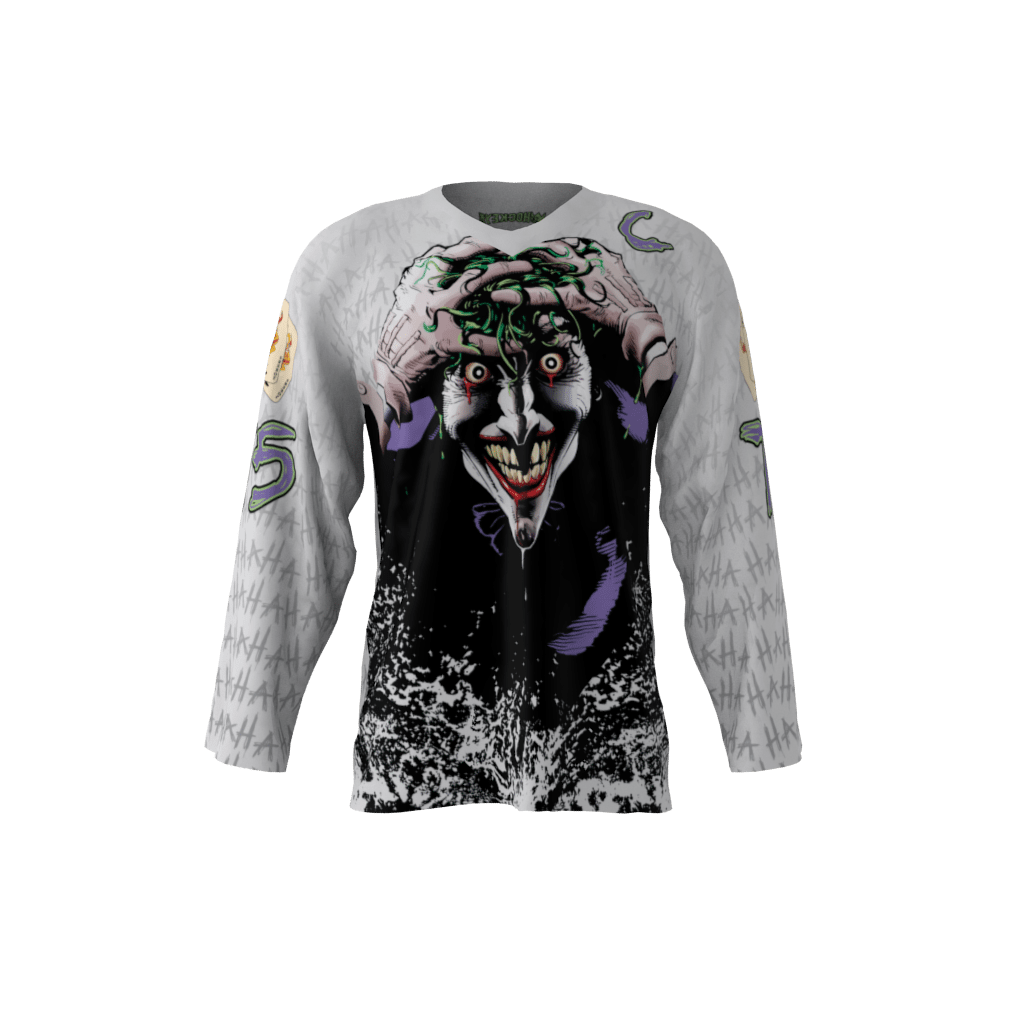 Jokers white dye sublimated custom hockey jersey. You can customize with your name and number! Jokers jersey font set has some lower case and some reversed letters. Joker hand writes in chaotic style apparently.