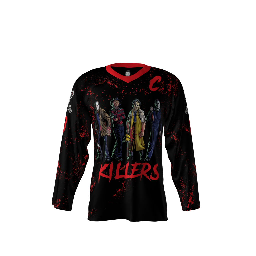 Killers Black Custom Dye Sublimated Hockey Jersey. You can customize with your name and number! Since all of our product offerings are customized specifically for you, you have the ability to change the colors and team names on any product. You want to swap the colors, team name, or logo from another product you’ve seen on our site? Or even put your own logo on instead? Not a problem. These simple alterations come at NO additional cost, either. Simply request any of the above in your order notes upon ordering. You’ll receive a proof once the order is received.