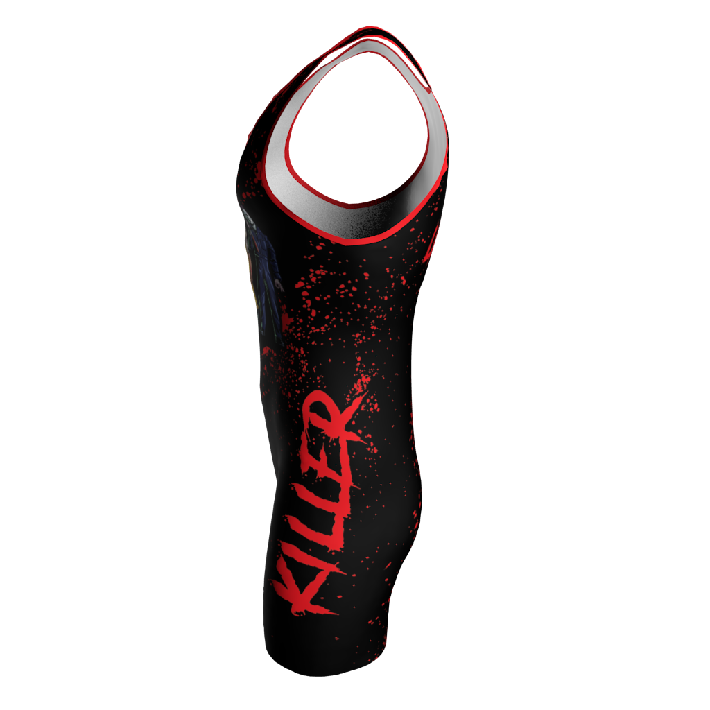 Custom Dye Sublimated Killers Wrestling Singlet. The designs are dyed right into the fabric for a smooth, vibrant, lightweight, high performing jersey. We cannot use unauthorized licensed logos (example: NBA, NHL, MLB, NFL team logos). If you upload licensed logos we will be forced to refund your order.