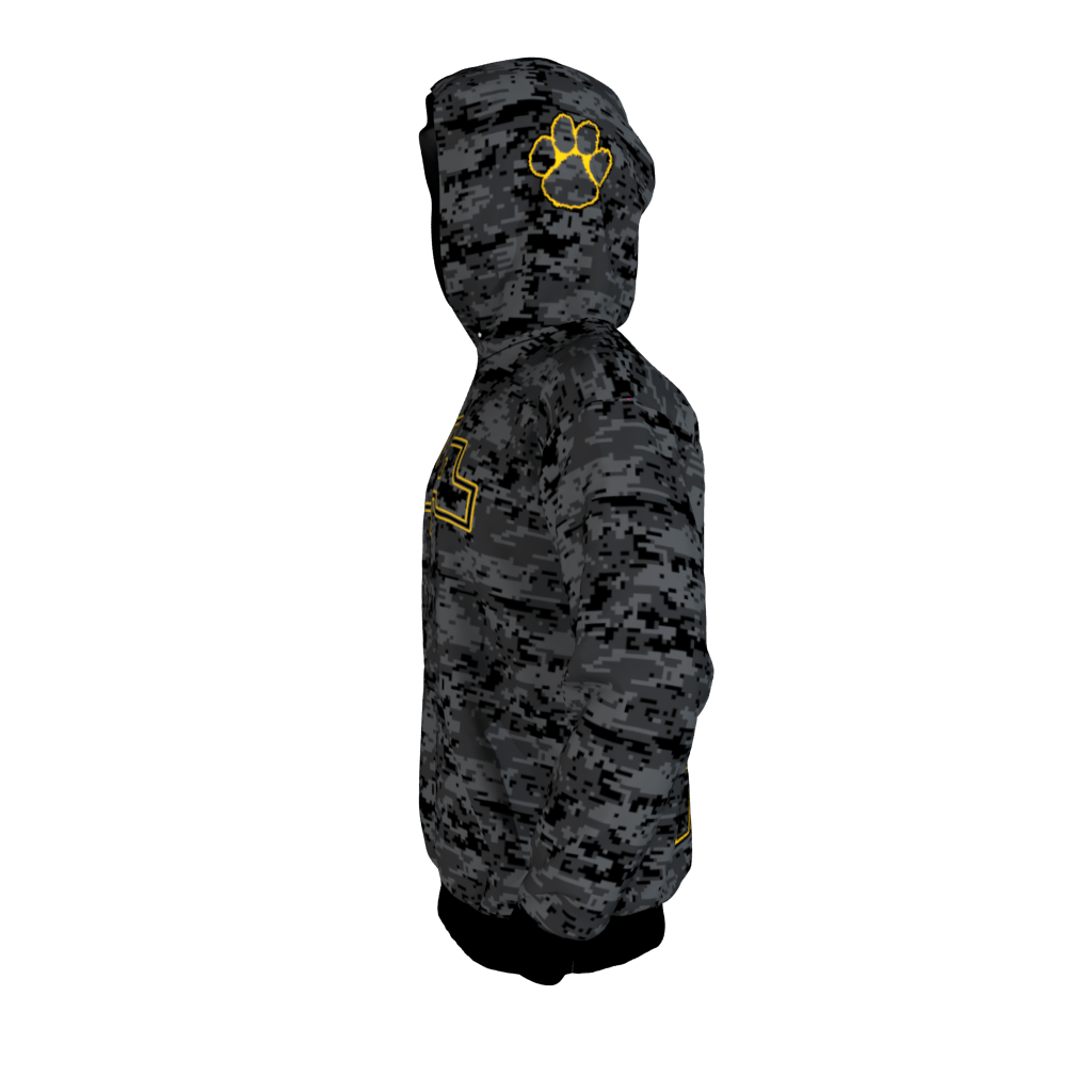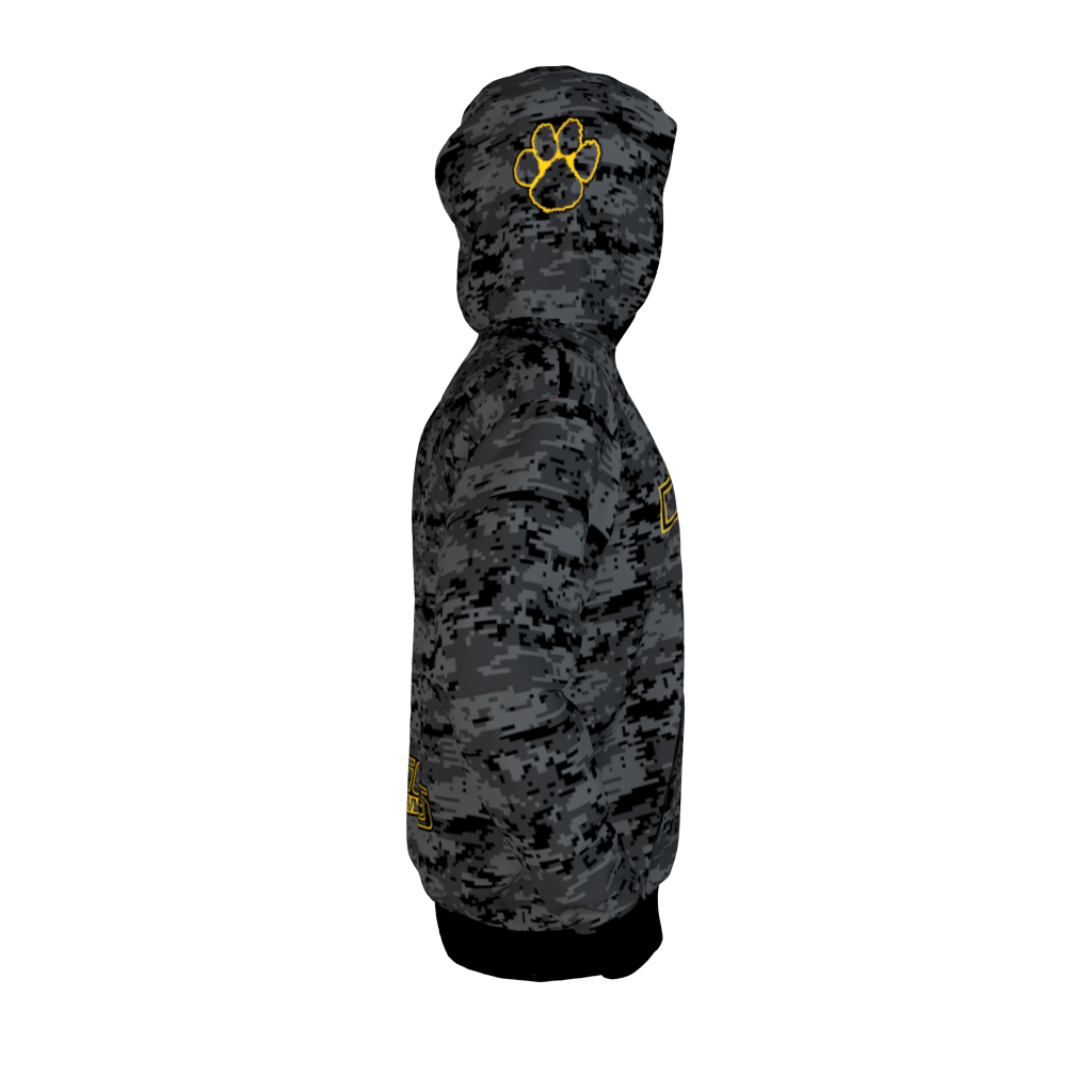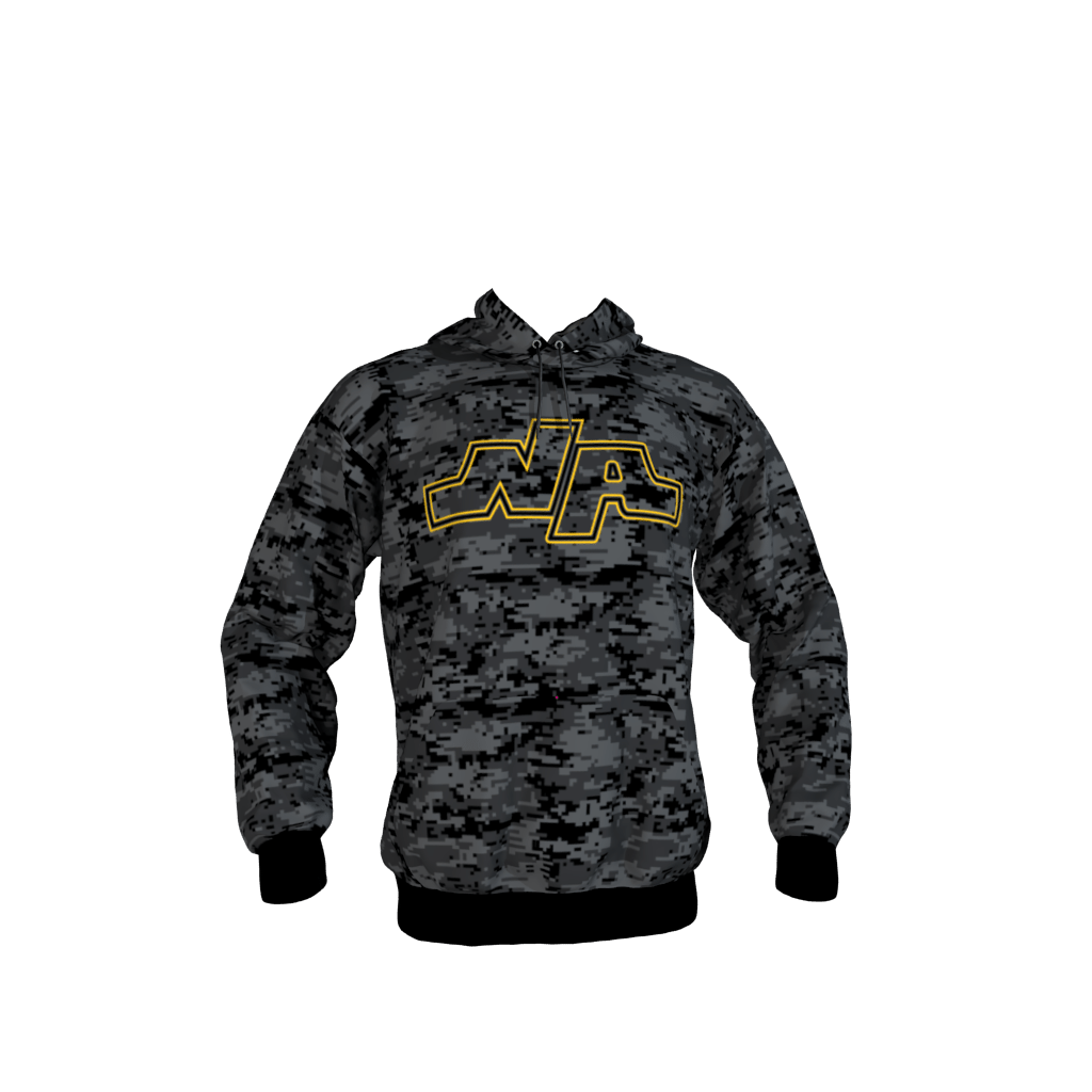 Sublimated NA Hoodie. Design is black/graphite/dark gray digi camo.