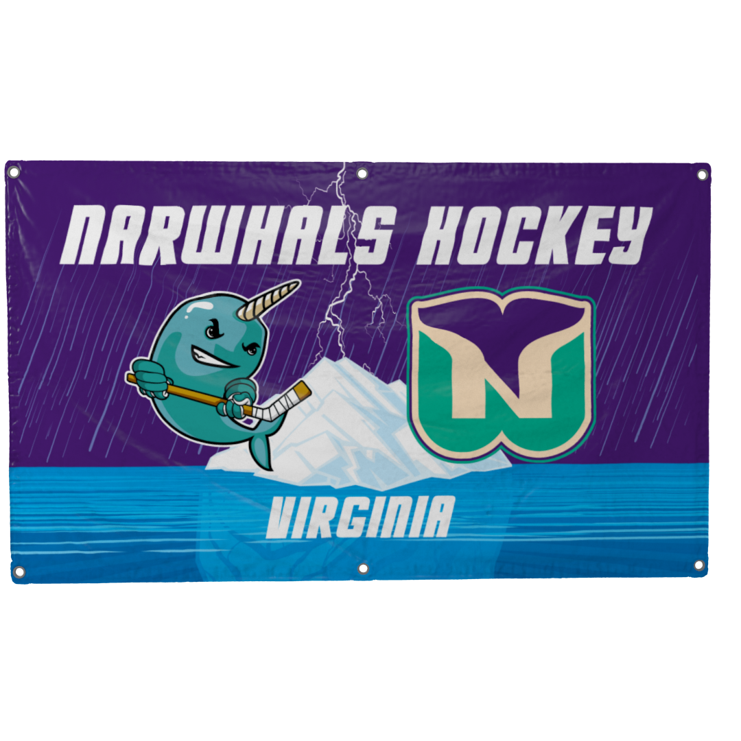 Narwhals Banner. 3 foot by 5 foot Dye Sublimated Banner. Printing is on one side. Comes with 6 grommets or you can request less in the checkout notes. Material is 100% polyester with a tight weave to resist snagging and very smooth to the touch.