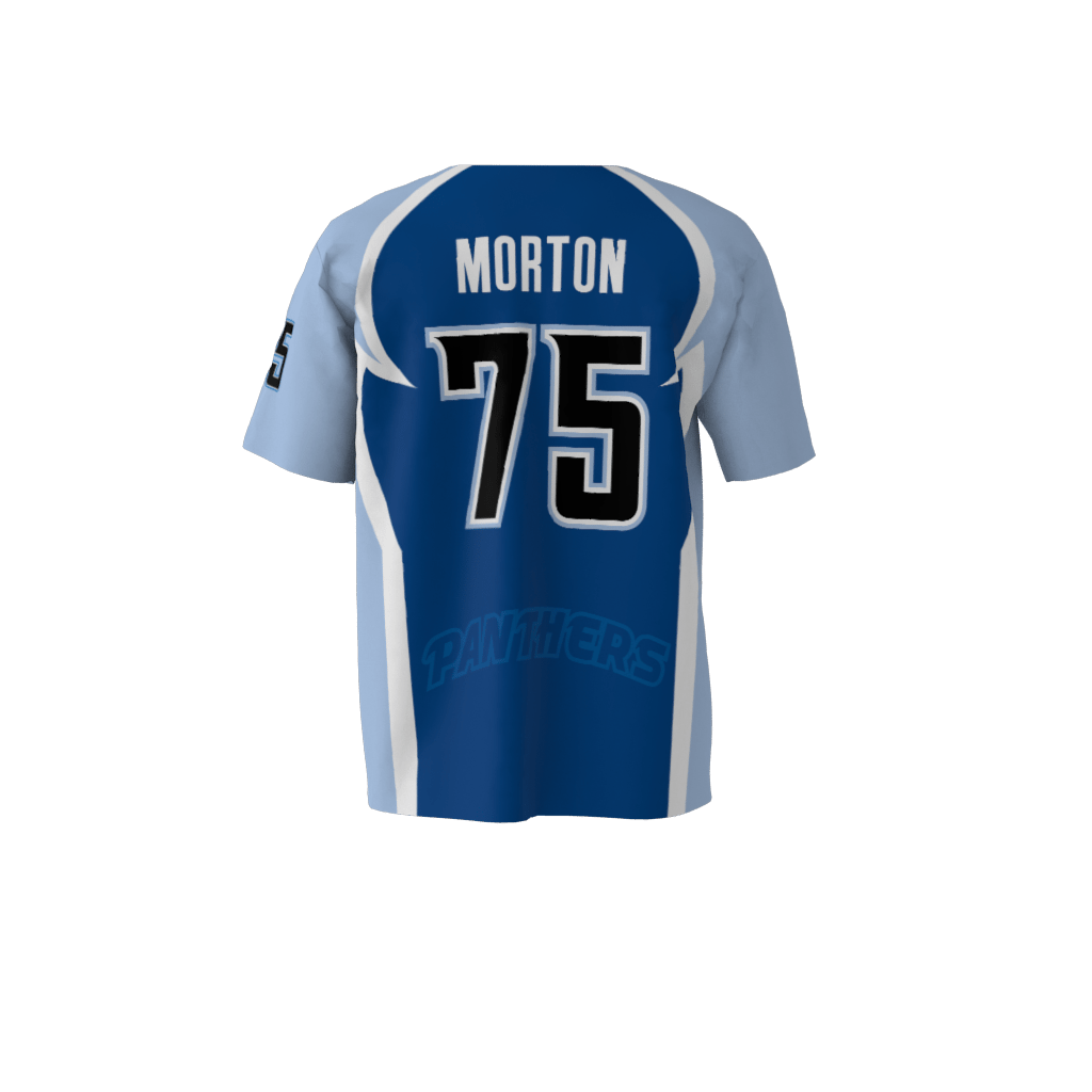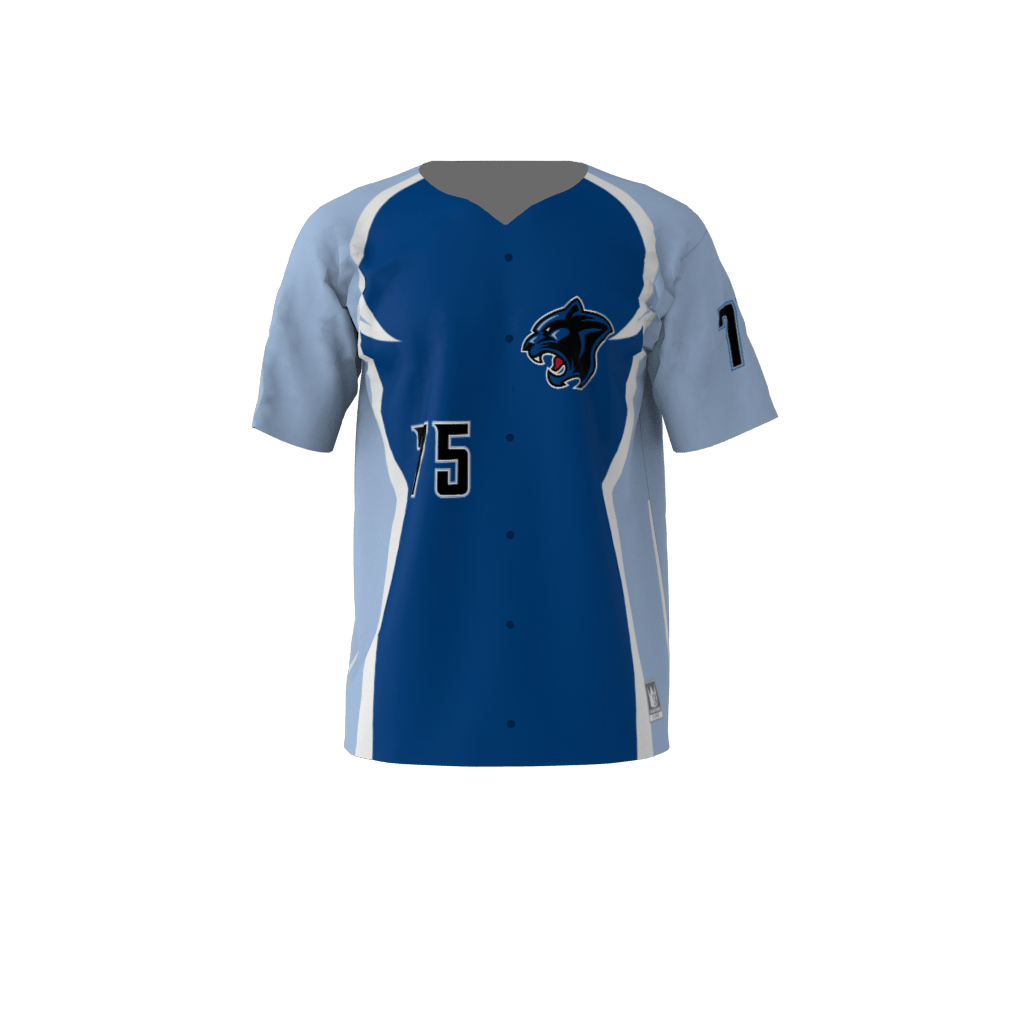 Panthers custom dye sublimated full-button baseball jersey. Available in any color combination. Materials and sizing information available here.