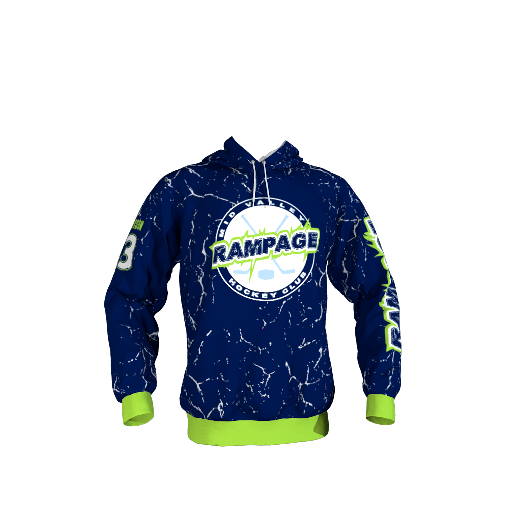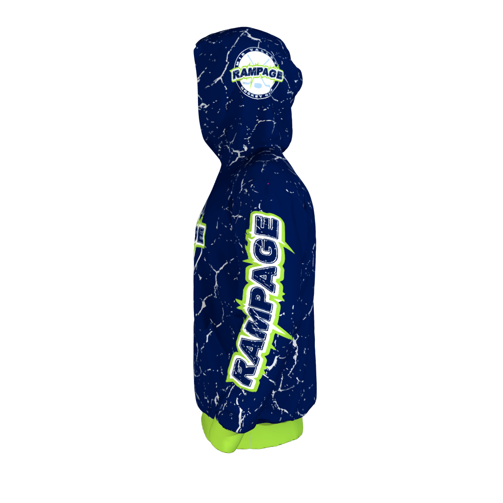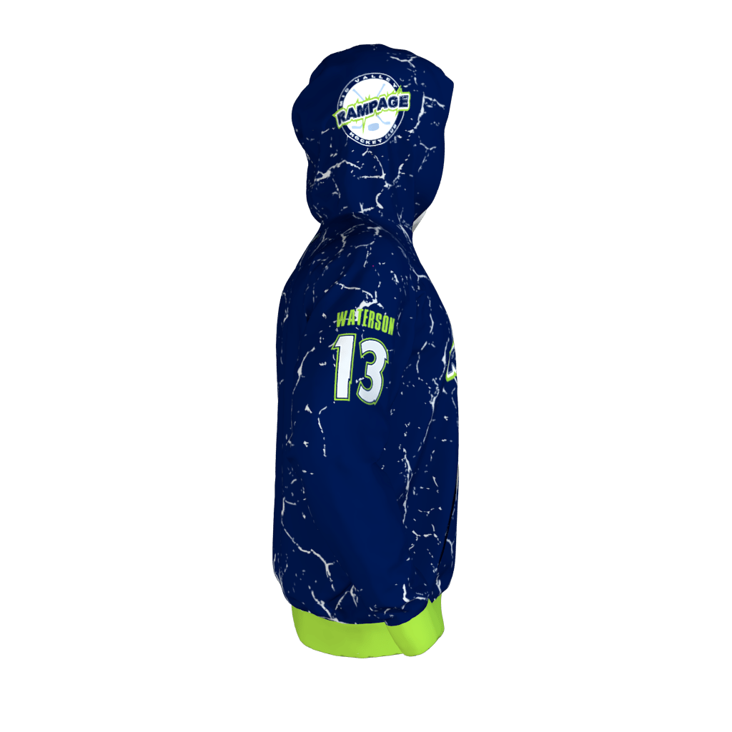 Rampage Hockey is decked out with crackle texture and splatter effects. Colors are lime green, gray and navy blue. May induce a course of violent, frenzied behavior or action while wearing. Custom designed hoodie for the Rampage hockey club. Add your name and number for complete customization!