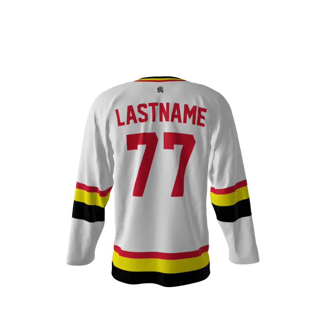 Roadrunners White Custom Dye Sublimated Jersey. You can customize with your name and number! Since all of our product offerings are customized specifically for you, you have the ability to change the colors and team names on any product. You want to swap the colors, team name, or logo from another product you’ve seen on our site? Or even put your own logo on instead? Not a problem. These simple alterations come at NO additional cost, either. Simply request any of the above in your order notes upon ordering. You’ll receive a proof once the order is received.
