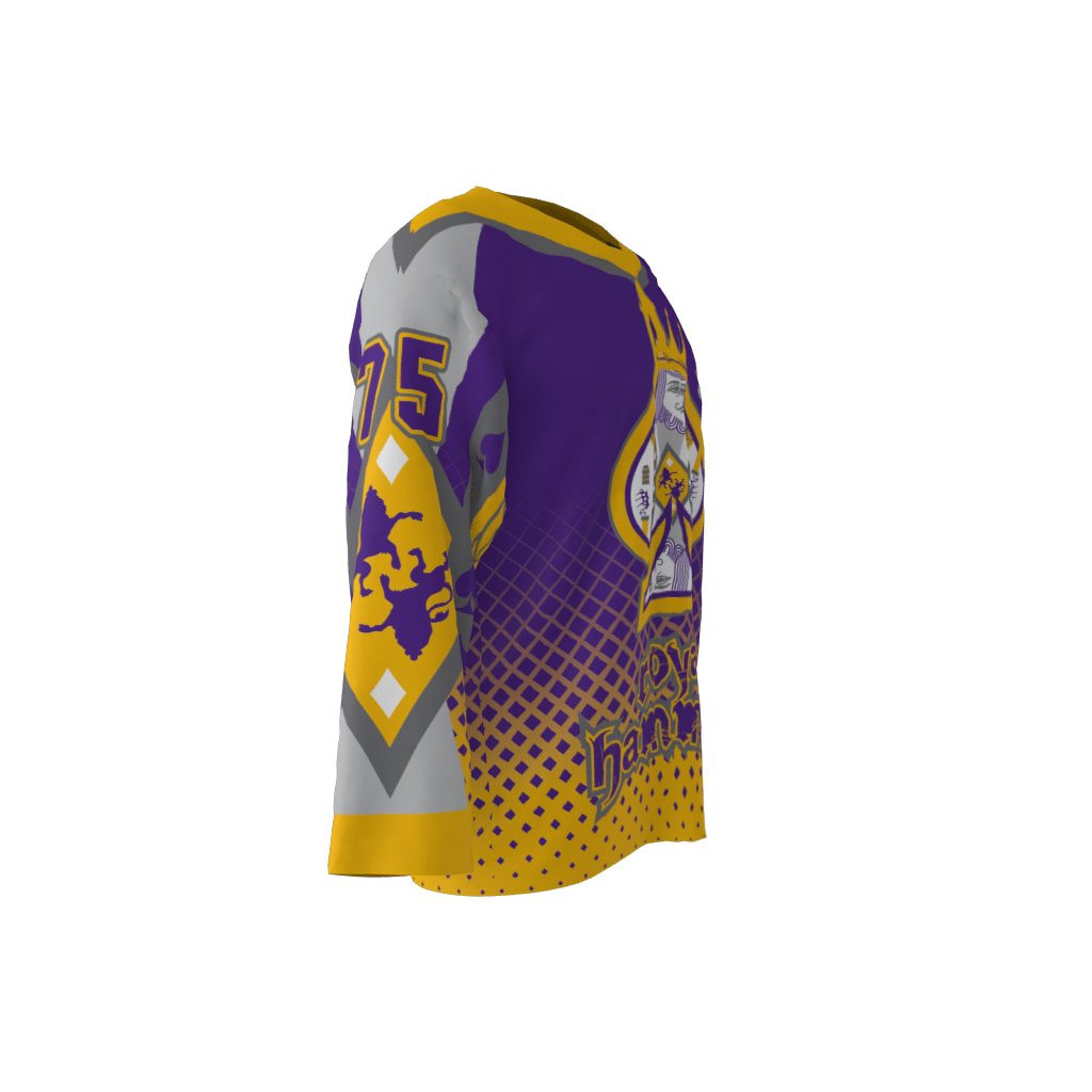 Ready to get Hammered Royally? It’s the Royal Hammers custom hockey jersey! A beautiful blend of purple and gold colors, this jersey features elements from popular playing card designs.