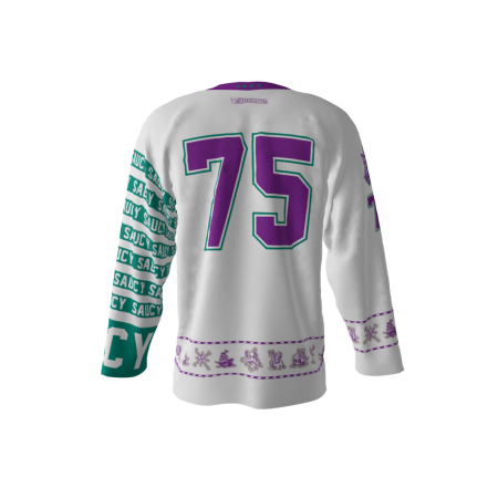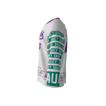 Saucy Squids dye sublimated custom hockey jersey. You can customize with your name and number!