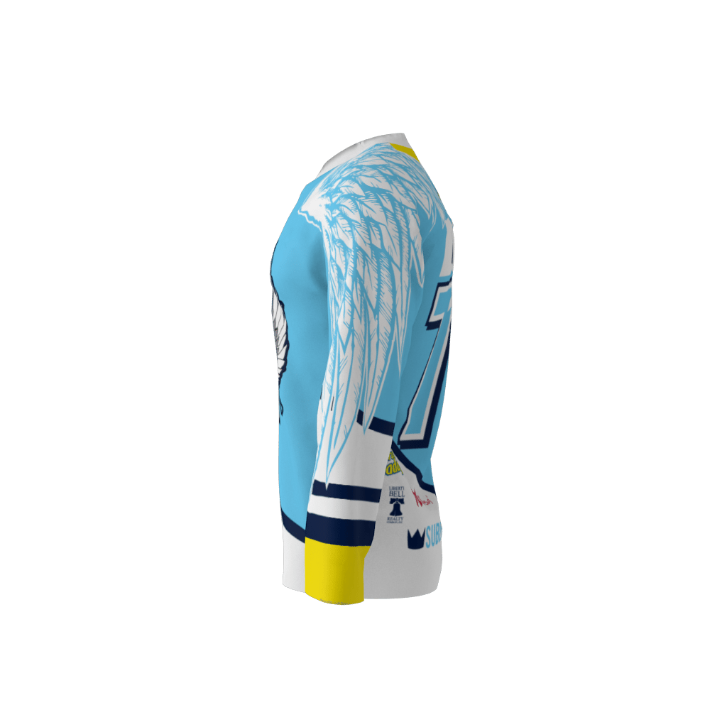 This jersey gets a lot of compliments around the rink. The Section 8 jersey has a great color palette with it’s powder blue/navy/yellow combo. The eagle and the wings on the shoulder give it distinction from other jerseys you’ll see.