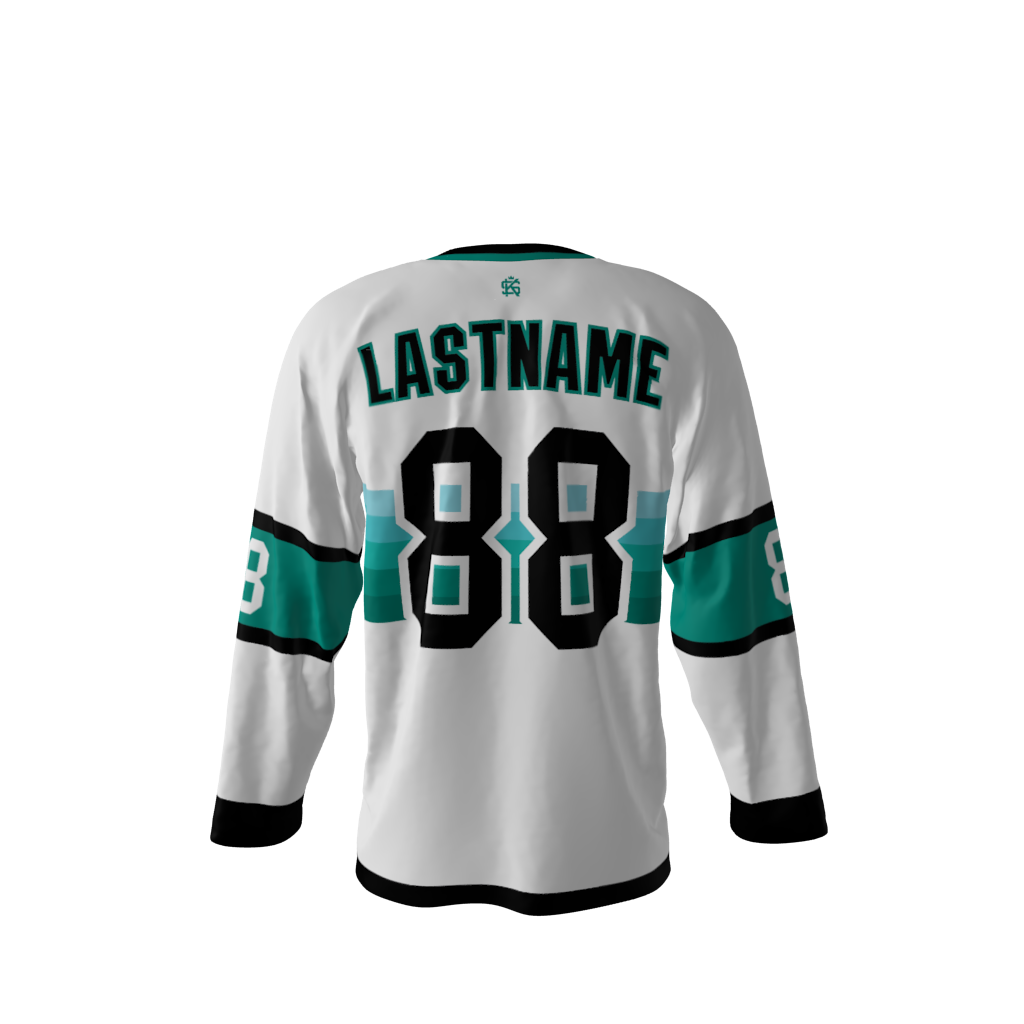 Sharks White Dye Sublimated Hockey Jersey! You can customize with your name and number! Since all of our product offerings are customized specifically for you, you have the ability to change the colors and team names on any product. You want to swap the colors, team name, or logo from another product you’ve seen on our site? Or even put your own logo on instead? Not a problem. These simple alterations come at NO additional cost, either. Simply request any of the above in your order notes upon ordering. When requesting changes, you’ll receive a proof once the order is received.