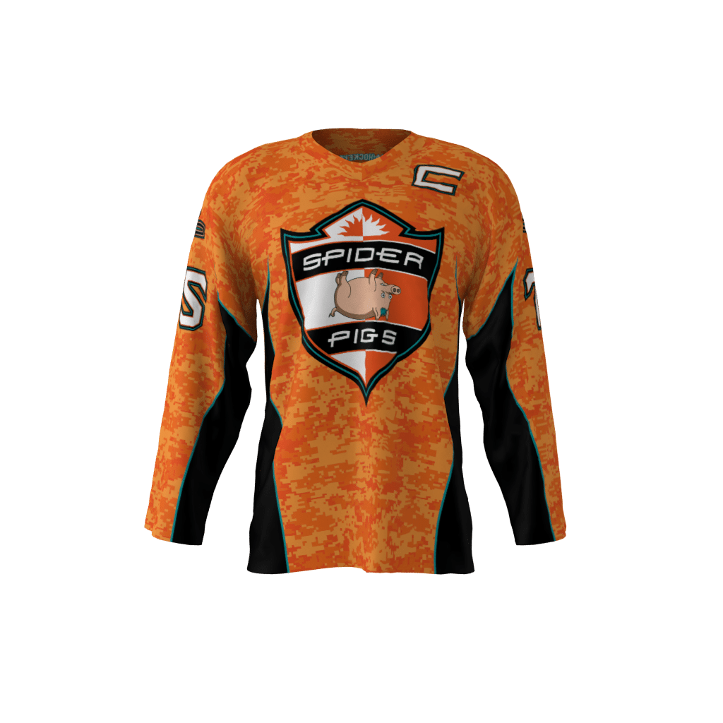 Spider Pigs custom dye sublimated hockey jersey. Personalize it with your own name and number.