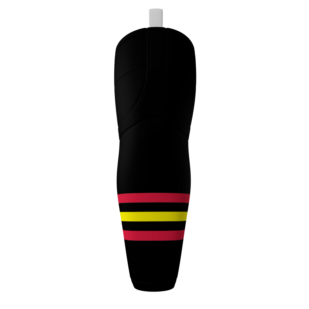 Thundercocks custom dye sublimated ice hockey socks. These socks have Velcro tabs and are similar to edge brand socks. The socks are produced with a moisture-wicking polyester material.