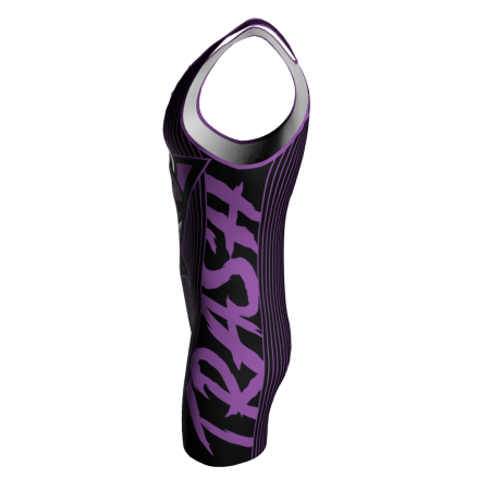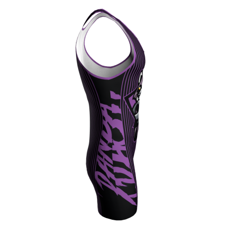 Custom Dye Sublimated Trash Panda Wrestling Singlet. The right side view of the singlet has a seam, and the artwork will not lineup, it will show with the words merged. The designs are dyed right into the fabric for a smooth, vibrant, lightweight, high performing jersey. We cannot use unauthorized licensed logos (example: NBA, NHL, MLB, NFL team logos). If you upload licensed logos we will be forced to refund your order.