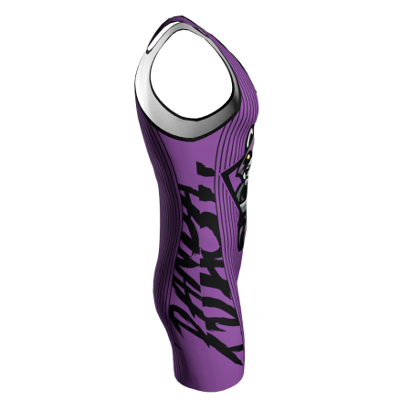 Custom Dye Sublimated Trash Panda Wrestling Singlet. The right side view of the singlet has a seam, and the artwork will not lineup, it will show with the words merged. The designs are dyed right into the fabric for a smooth, vibrant, lightweight, high performing jersey. We cannot use unauthorized licensed logos (example: NBA, NHL, MLB, NFL team logos). If you upload licensed logos we will be forced to refund your order.