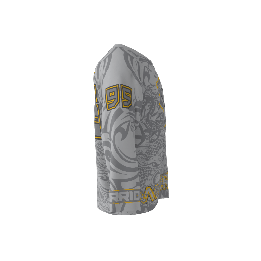 This jersey is for the true hockey warrior, a person skilled in ice or roller hockey combat. The base is light gray with gray tribal art blending into a dragon at bottom. Front chest logo is warriors shield guarded by two dragons with a touch of gold.